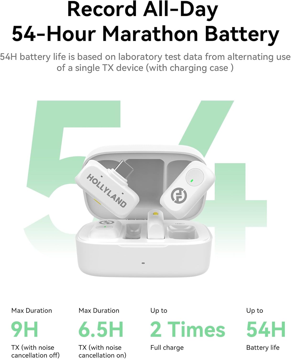 - Up to 54h Battery Life: Achieve up to 54h using one transmitter (TX) alternately with the charging case—ideal for long shooting days without battery anxiety.