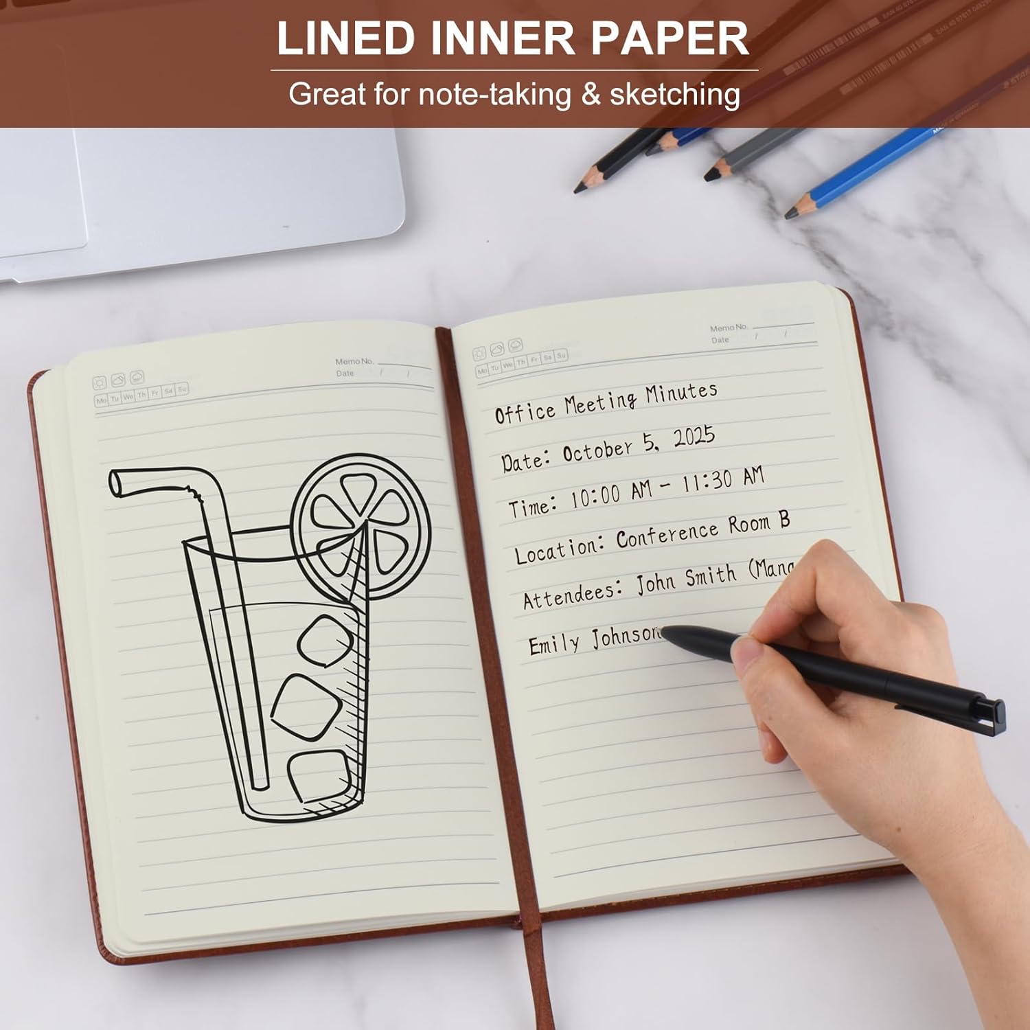 - Vintage Faux Leather Journal: The notebook features soft vegan faux leather cover, protecting your percious ideas and notes.These ruled journal notebook is perfect for taking notes, writing, meeting and etc. It will be a good partner for you at work, school, travel and daily life. The paper are made of FSC-Certified wood