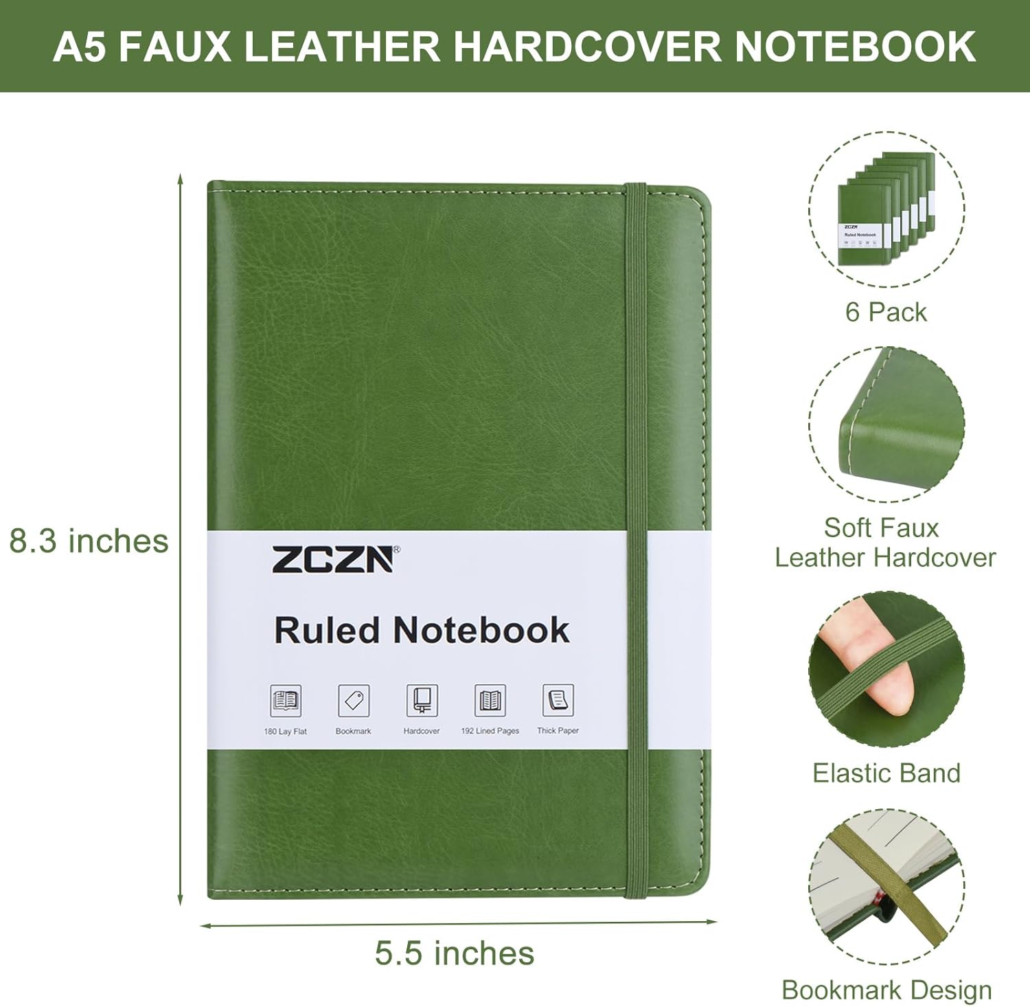 ZCZN 6 Pack Lined Journal Notebooks, 192 Pages A5 Hardcover Leather Journals for Work,Writing,School & Travel, College Ruled Journaling Notebooks for Notes Taking,Diary Notepad (Light Green*6)