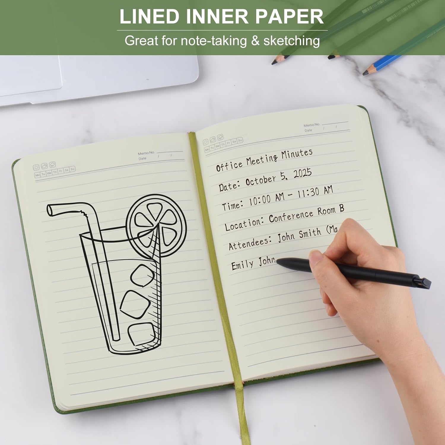 - 192 Pages Lined Journal Notebooks: 6 light green hardcover notebook, 192 pages/96 sheets per notebook (1152 pages/ 576 sheets in total), adequate for work, meeting, studying. The paper of the leather notebook is thick enough that ink won't bleed through. The light yellow paper is more eyes comforting, release eyes burden when writing. It is the ideal notebook for work, school, meeting, travel and dairy