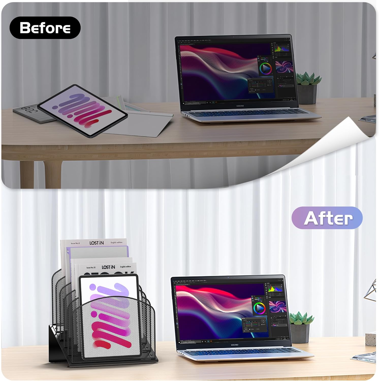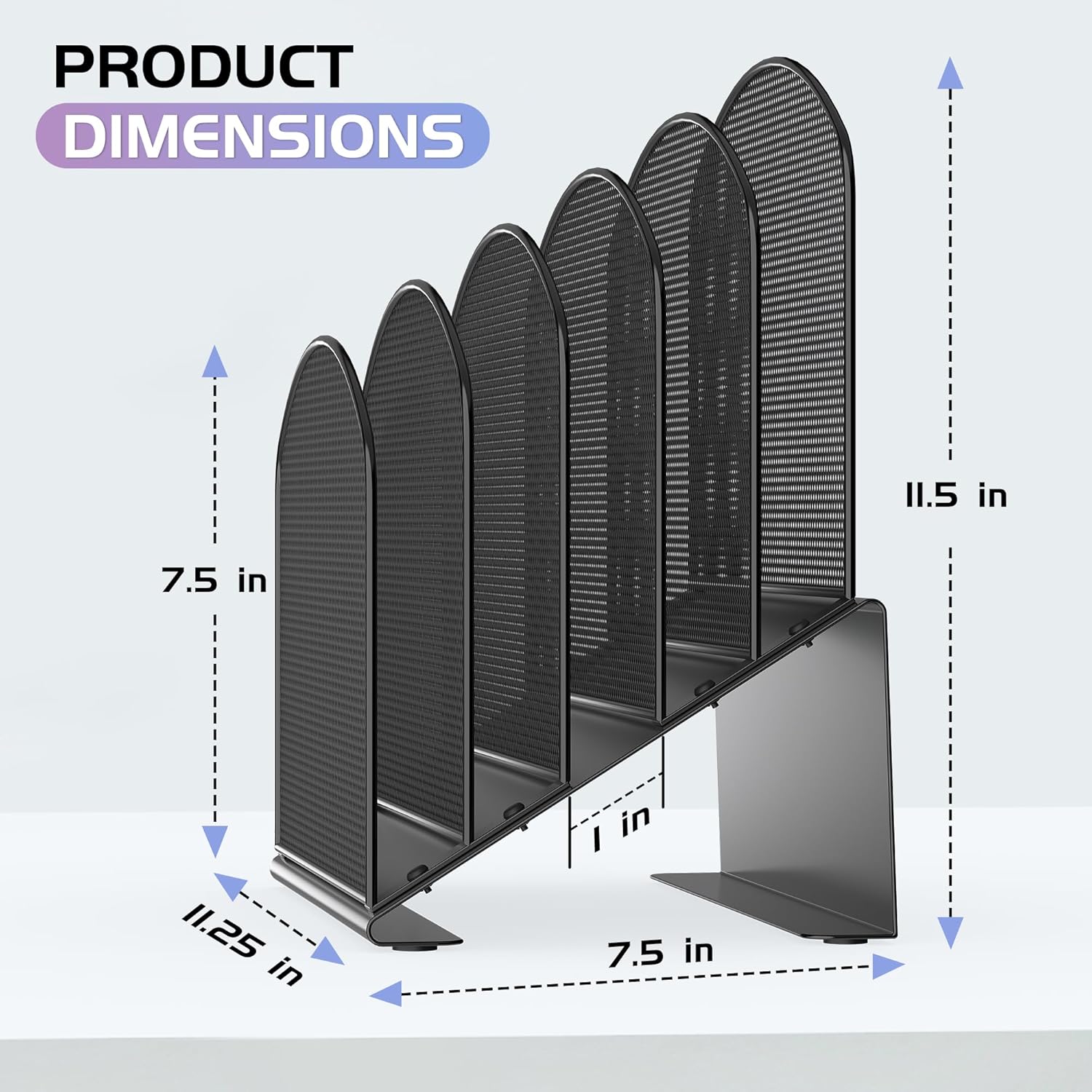 Inclined Desk File Organizer Metal Desk Magazine Folder Holder with 5-Section Vertical Compartments Rack File Organizer for Office, Home, School, Black