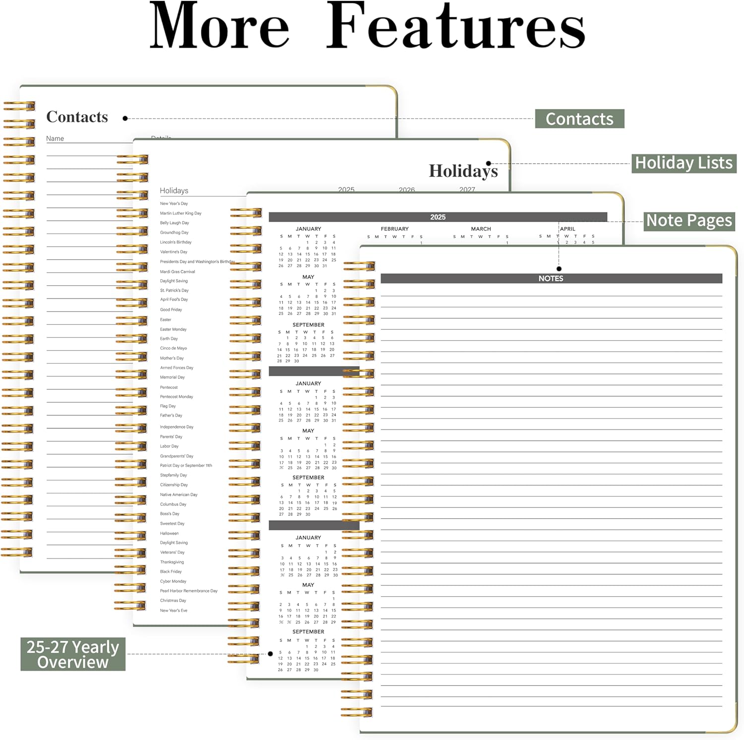 - 2025 - 2026 Appointment Planner - Spanning from July 2025 - June 2026, is designed to help you manage your life and enhance your work efficiency. It features an annual overview calendar for 2025, a contact page, a holiday page, monthly calendar sections for each of the 12 months, 53 weekly calendar sections with space for notes, and an annual review section. These elements combine to provide a comprehensive organizational tool.