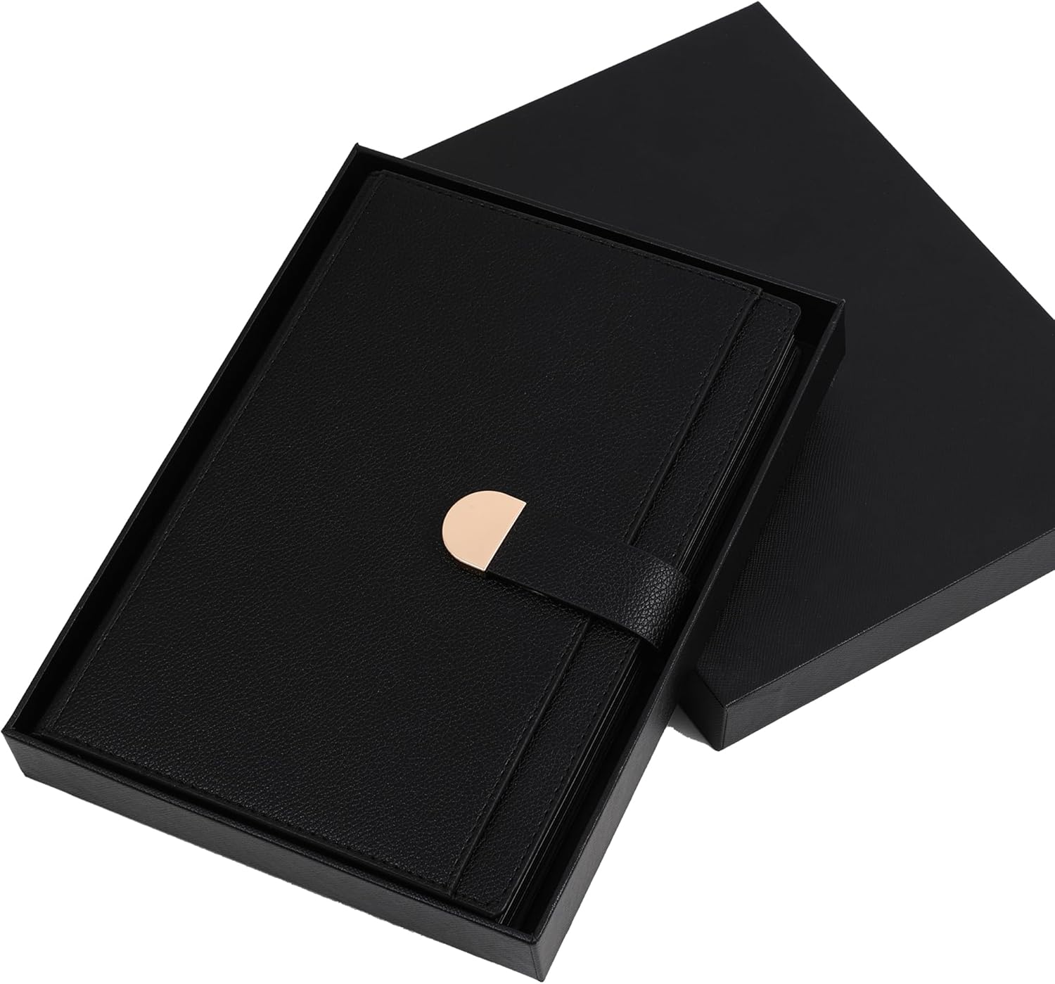 - Leather Notebook: The black journaling notebook comes with a black box, a perfect present for your mom,dad, husband, wife, teachers and colleague who love to write, study, or work. The magnetic buckle journal is suited for all office, school and home use to help you take notes, keep work or journal for brainstorming ideas