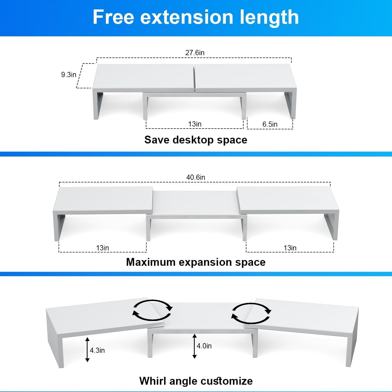 - 【Expand Desktop Space】The desk monitor stand increases your desktop storage space by elevating the monitor, optimizing storage efficiency. Customizable width allows you to adjust the distance between side shelves to control storage size and footprint, eliminating worries about limited desk space.