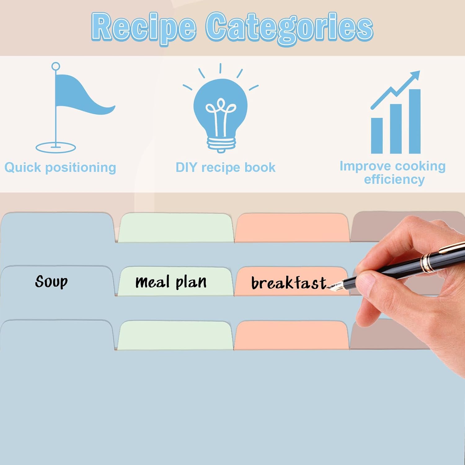 - 5. Make your own recipe book:The recipe dividers provide plenty of space for customization. You can record all your best recipes! The neutral Morandi tone blends in with any decor, and the different colors can be categorized by cuisine, making them perfect recipe dividers for your DIY organizational binder.