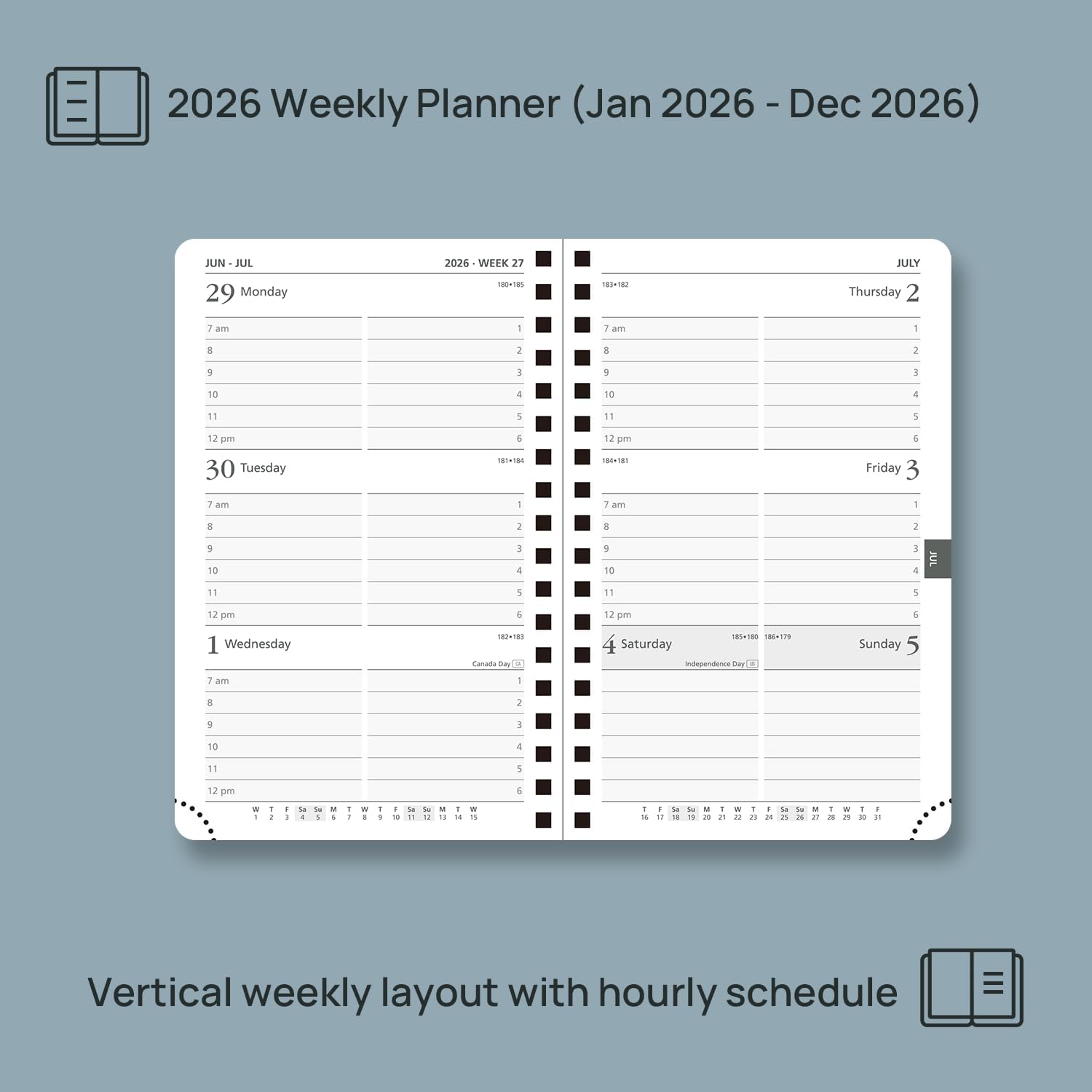 - 2 PAGES PER WEEK:Lay flat week-to-view on 2 pages, this weekly planner (Jan 2026 - Dec 2026) presents spacious everyday planning with hourly schedules for your appointments, which makes your busy daily routines organized.