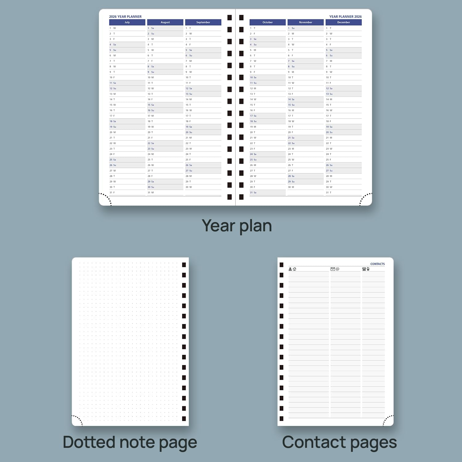 - EXTRA PAGES: This 2026 daily planner also contains "2026-2027" Year Planner Page + "2026" Calendar Page + Contacts Pages + Password Page + Holidays Reference Pages + 4 Dotted Notes Pages for jotting down your ideas, thoughts or any other happy things in detail.
