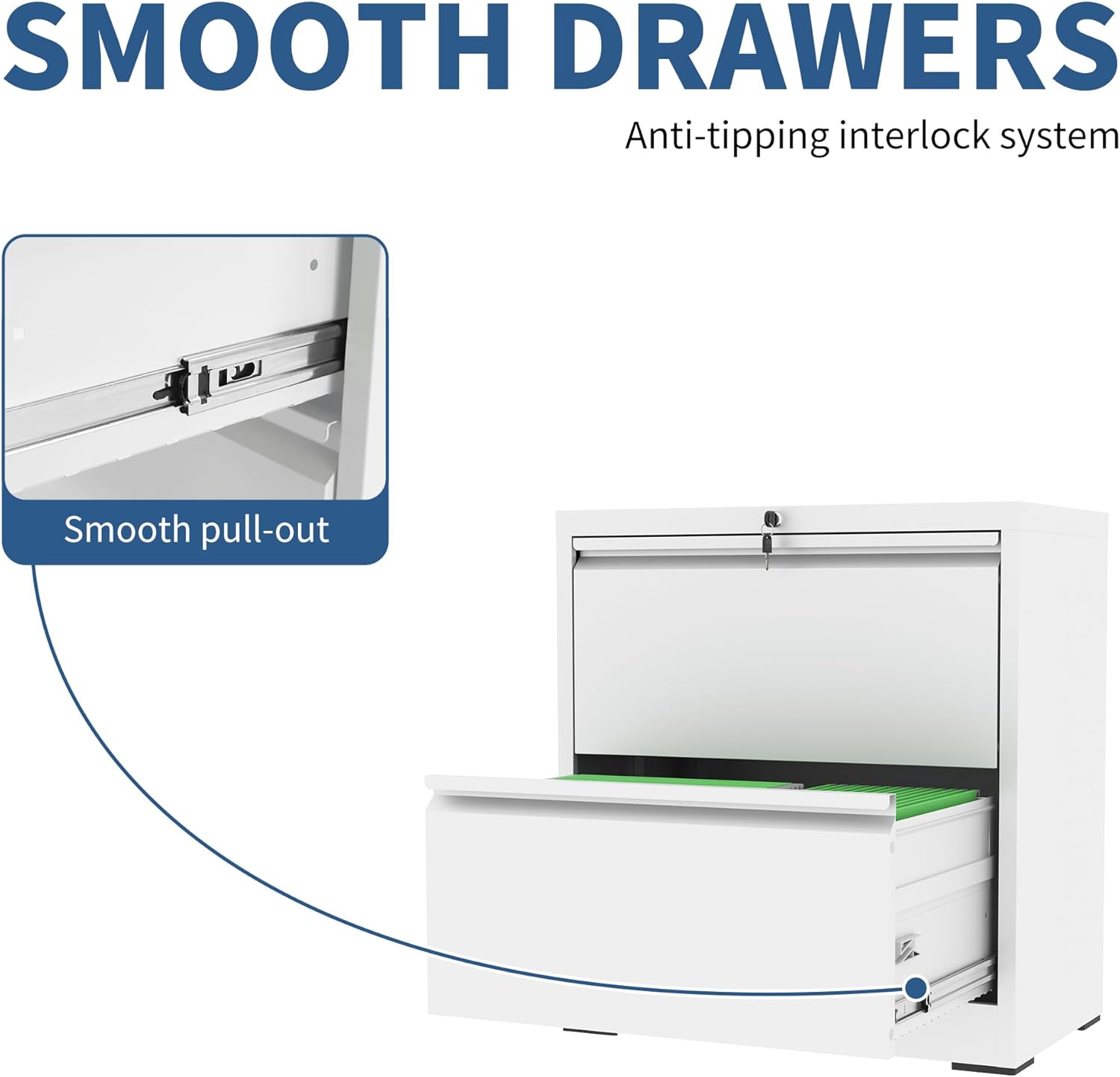 - ăEnhanced Safety Featuresă To prevent tipping hazards, FLIXELIO 2 drawer file cabinet with lock includes a built-in anti-tip mechanism that allows only one drawer to open at a time. This thoughtful design minimizes safety risks and ensures stability, even when multiple drawers are in use.