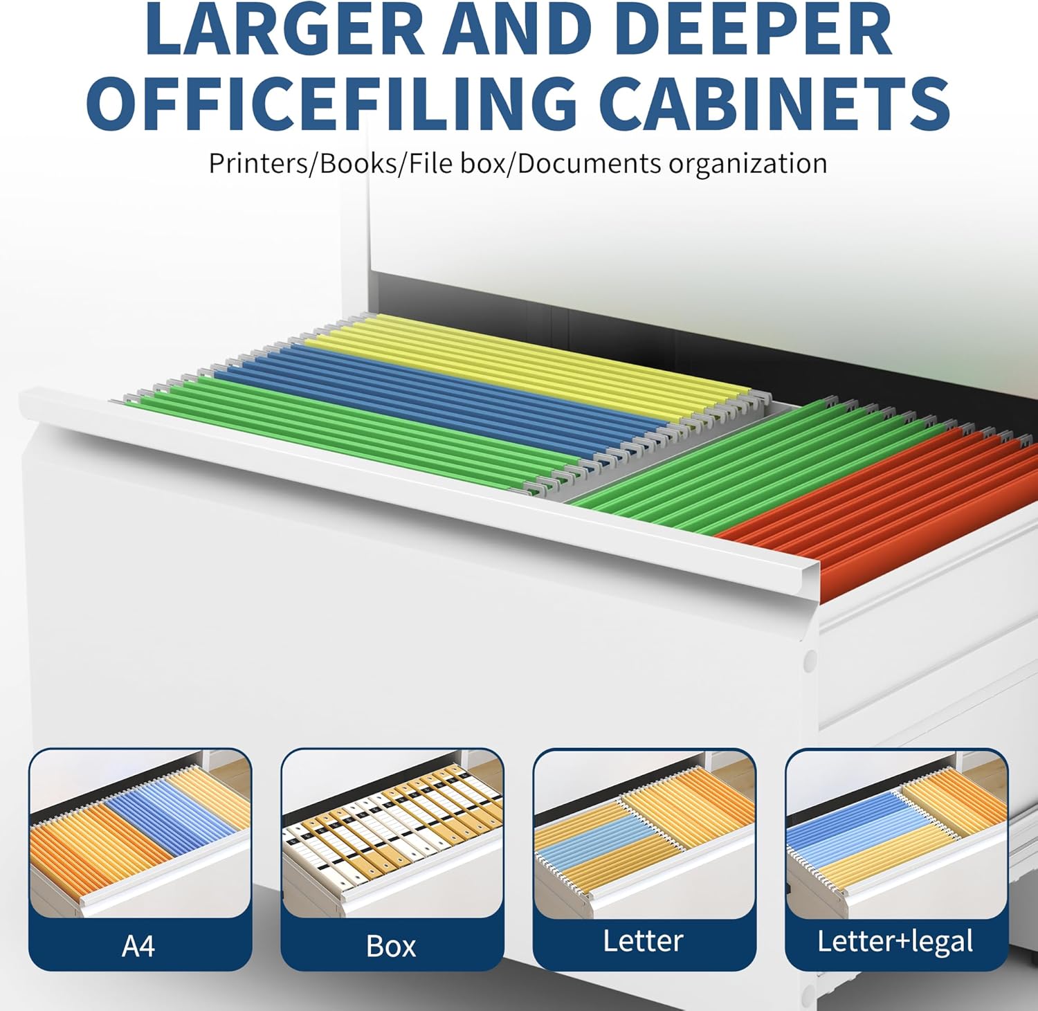 - ăVersatile Storageă This file cabinets for home office is designed for multiple uses. Each drawer comes with a hanger-on clip, accommodating legal, letter, and A4-sized documents or file boxes.