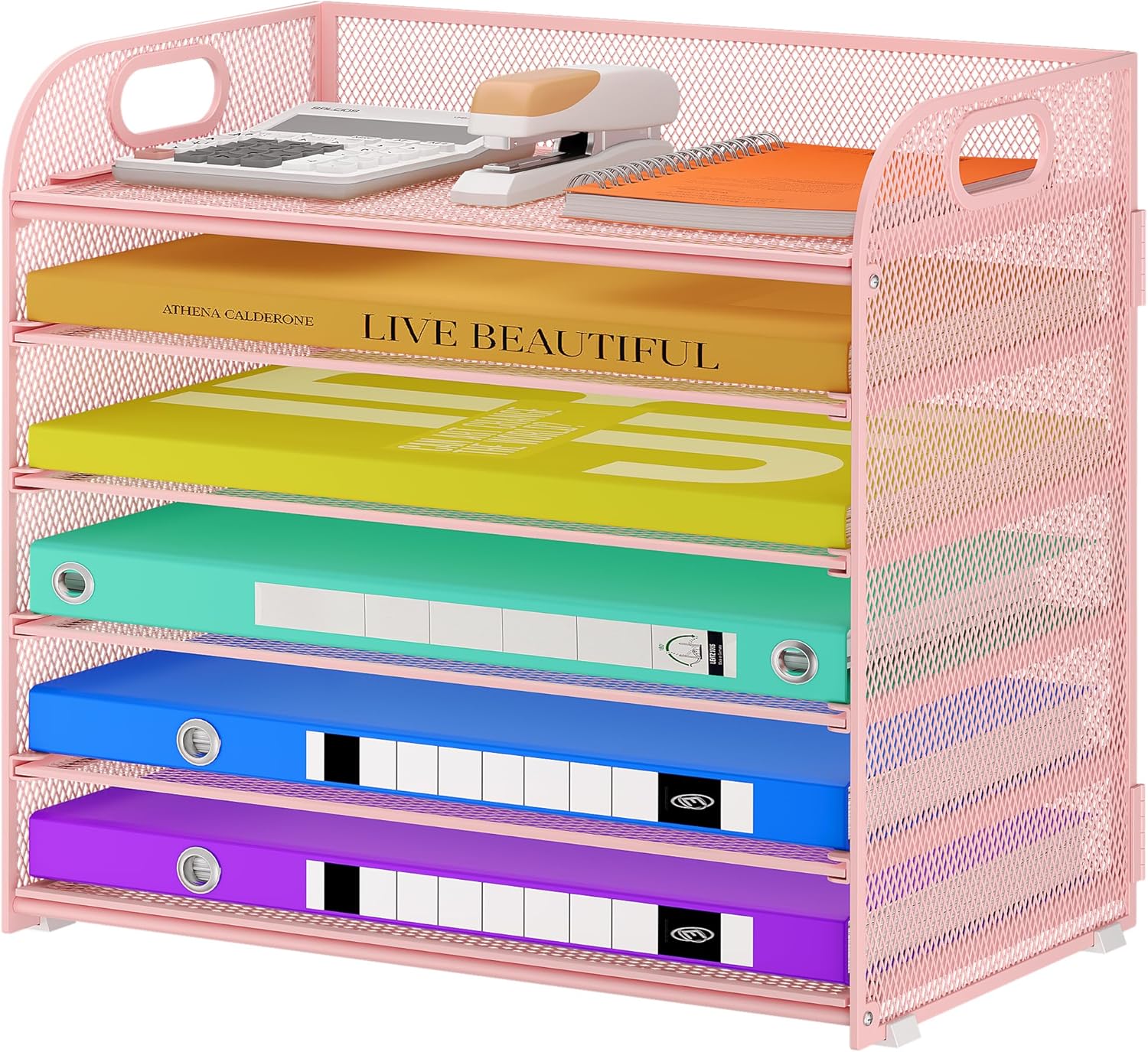 6 Tier Paper Organizer with Handle, Metal Desk Organizer Mesh Paper Letter Tray Desktop File Folder Document Sorter for Classroom, School, Office Accessories Organization and Storage - Pink