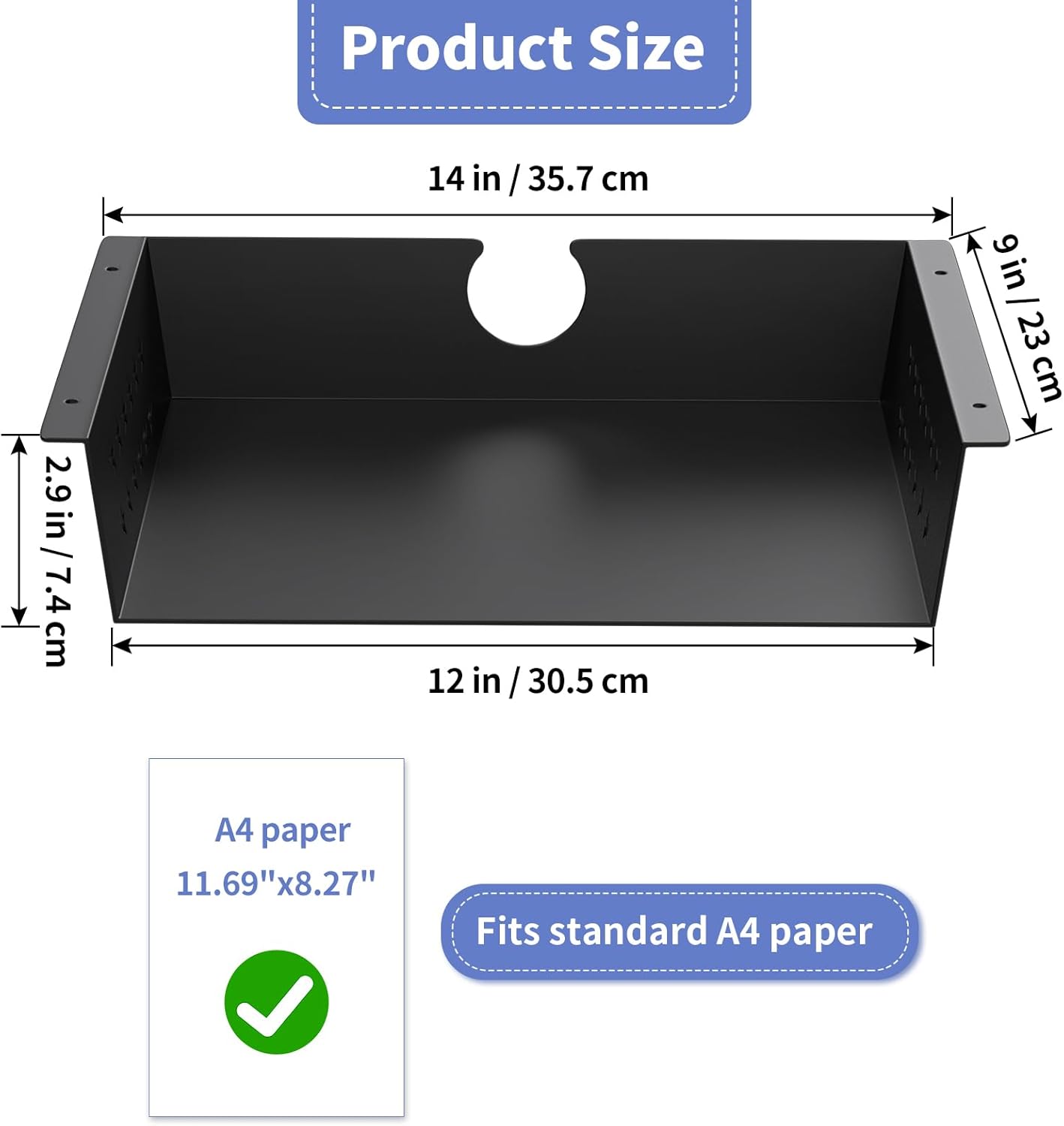 - Large Size: Under desk storage shelf measures 9"D x 14"W x 2.9"H, can fit standard A4 paper, offers ample space to organize notebooks, cables or chargers, and features a cable cutout on the back and ventilation holes for air circulation