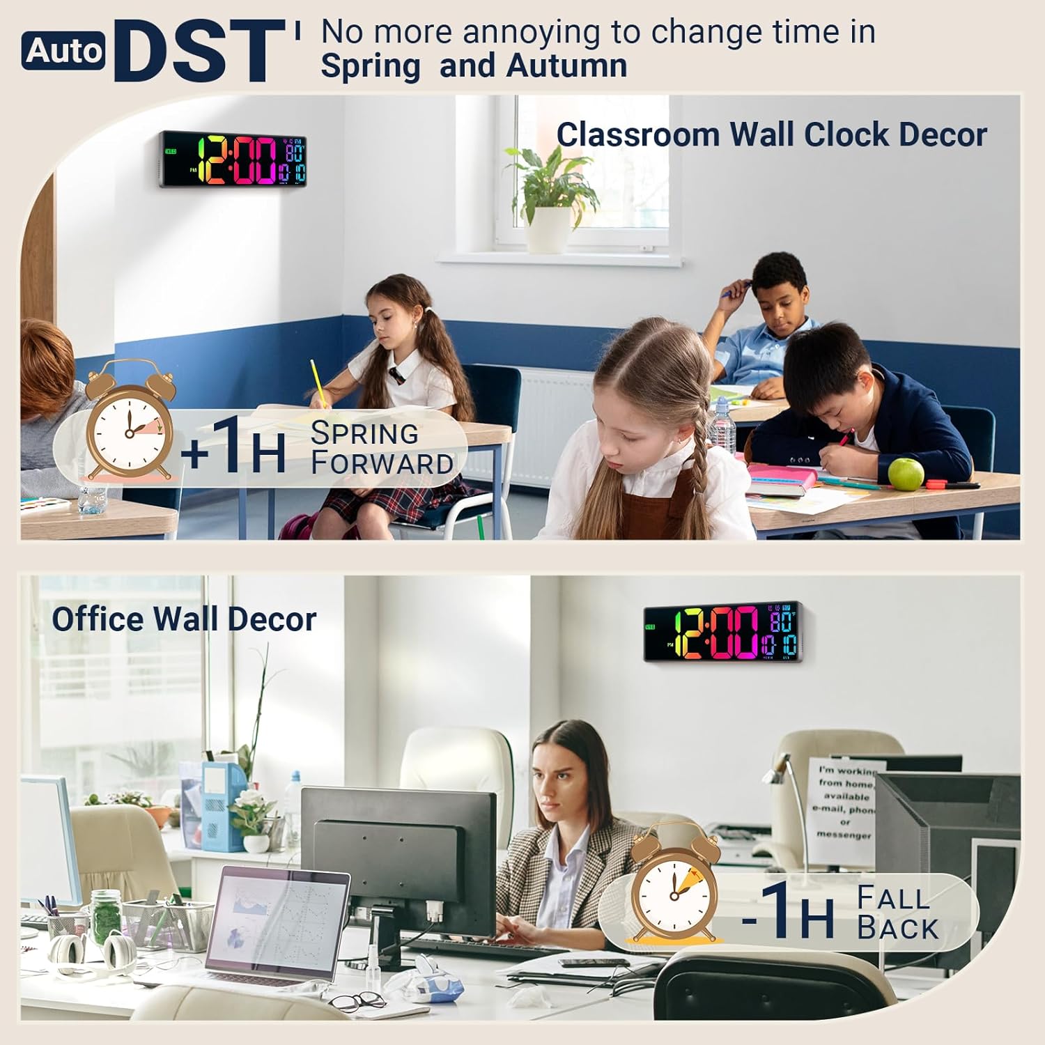- Auto DST and Auto Brightness: It will automatically switch between DST time in March and November. You'll never have to remember to change the time again. Additionally, a built-in light sensor adjusts the display brightness automatically for comfortable viewing at any time. C° and F° are adjustable