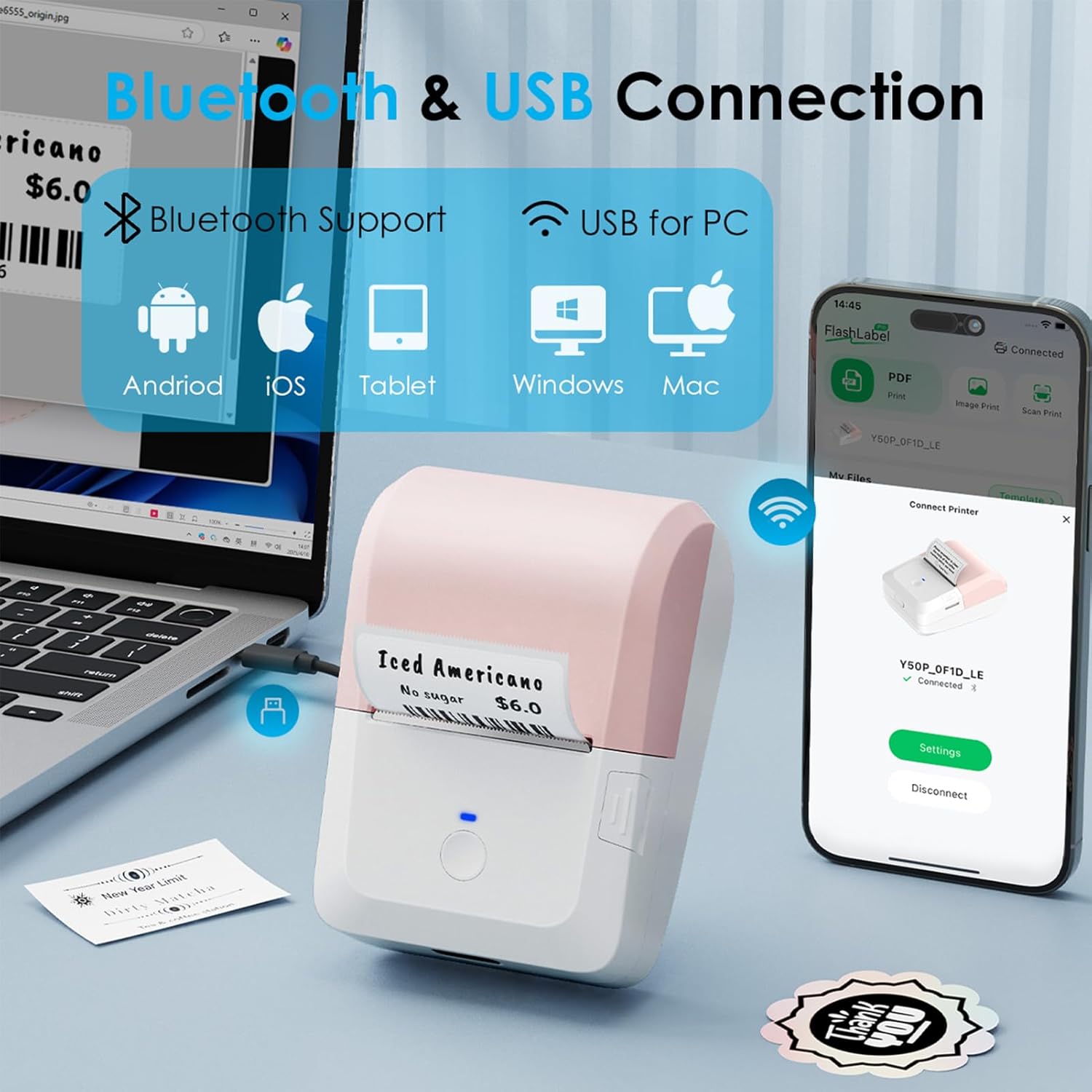 - Bluetooth Wireless Printing Made Easy: KNAON Portable Thermal Label Printer supports Bluetooth connectivity, enabling smooth wireless printing from your smartphone, tablet, or laptop. To get started, for iOS and Android users, simply download the ‘FlashLabel Pro’ app from the Apple App Store or Google Play Store. Please note: Devices must connect through the ‘FlashLabel Pro’ app — direct Bluetooth pairing is not supported.
