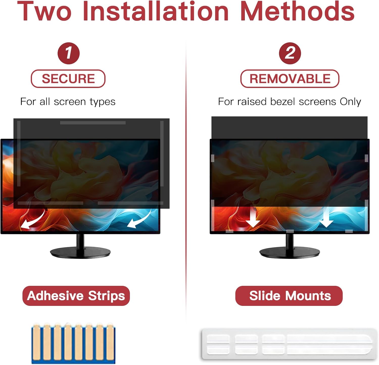 - 【Two Attachment Options】Our computer privacy screen 21.5 inch can use 2 installation options complete installation quickly, perfect fit with no bubbles. Option 1 you can apply clear adhesive strips directly on the monitor privacy screen filter to securely attach to any computer monitor screen; Option 2 (for computer screens with a raised bezel only) use slide mount tabs that easily stick to the display frame, allowing you to slide the privacy screen filter on and off as needed.