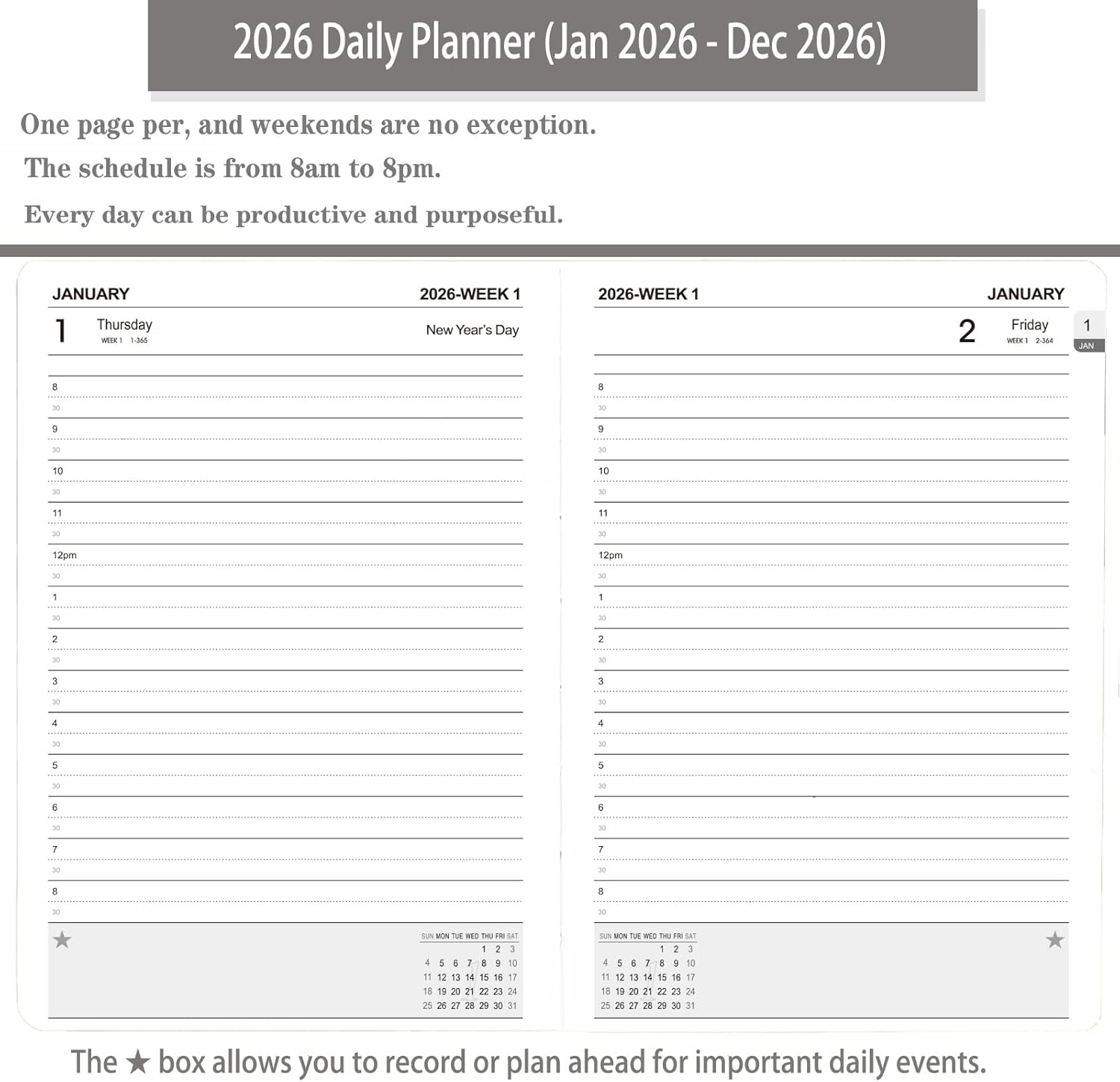- One Page Per Day: This 2026 Daily Planner runs for 365 days from January 1 to December 31, 2026. One page for each day even on weekends, so you can effortlessly keep track of your appointments, tasks, and goals.