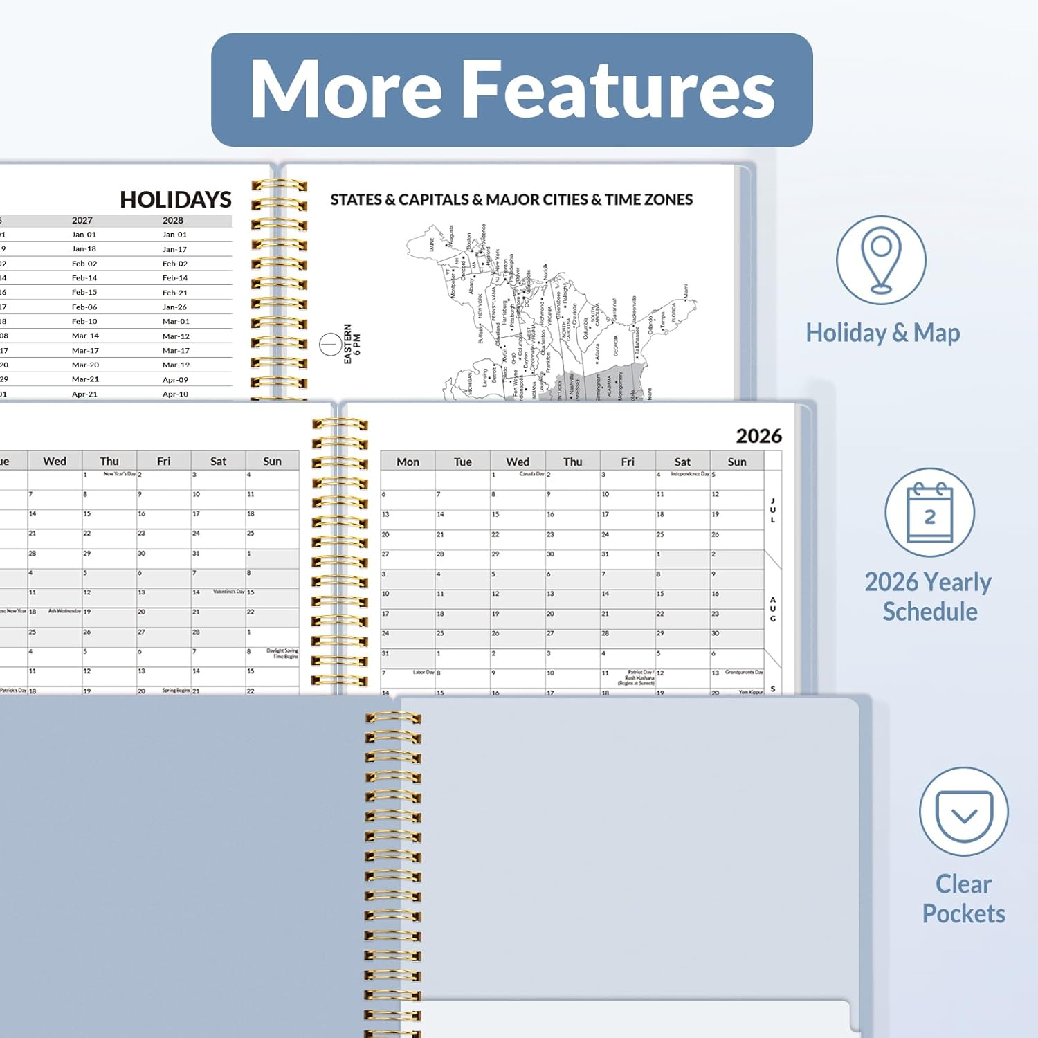 - Additional Features - The weekly planner includes 2026-2028 calendars, year schedule for full year 2026, holiday lists, contact pages, notes pages, important dates, and US time zone map. Rainbow monthly tabs simplify navigation and add a stylish, playful element to the planner's aesthetic.