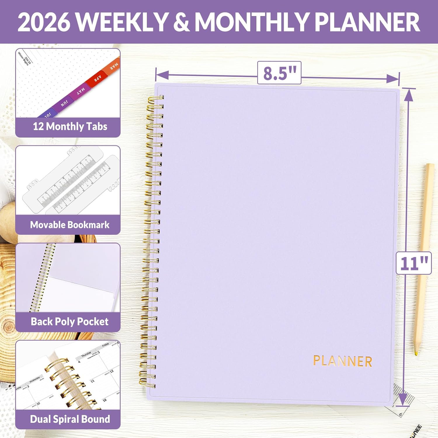 SUNEE 2026 Weekly and Monthly Planner - from January 2026 - December 2026, 8.5"x11" Daily Agenda Planner with Monthly Tab, Flexible Cover, Note Pages, Pockets, Bookmark, Spiral Binding, Purple