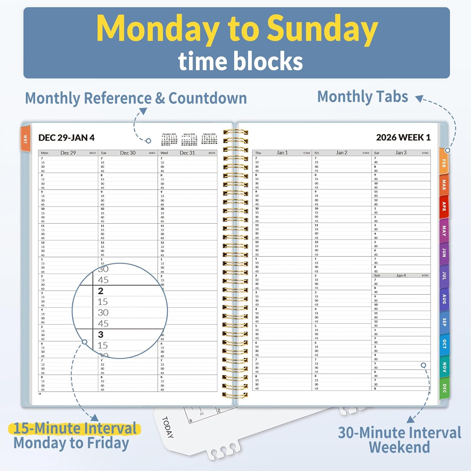 - Weekly View - 2-page weekly layout from Monday to Sunday, 15-minute time slots in increments from 7:00 a.m. to 8:45 p.m. on weekdays, and 7:00 a.m. to 8:30 p.m. on weekends, 3-month reference previews, allowing you to manage time and track appointments easily.
