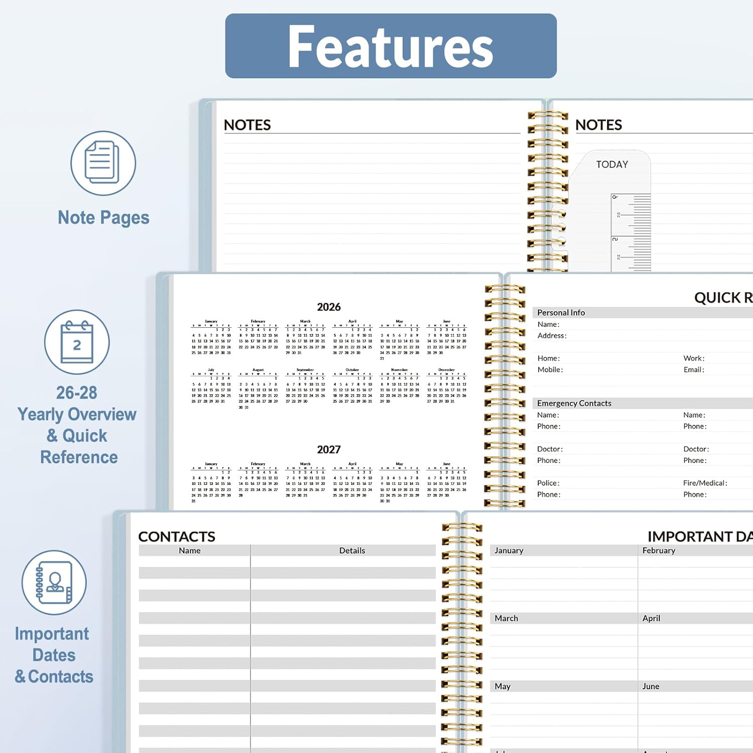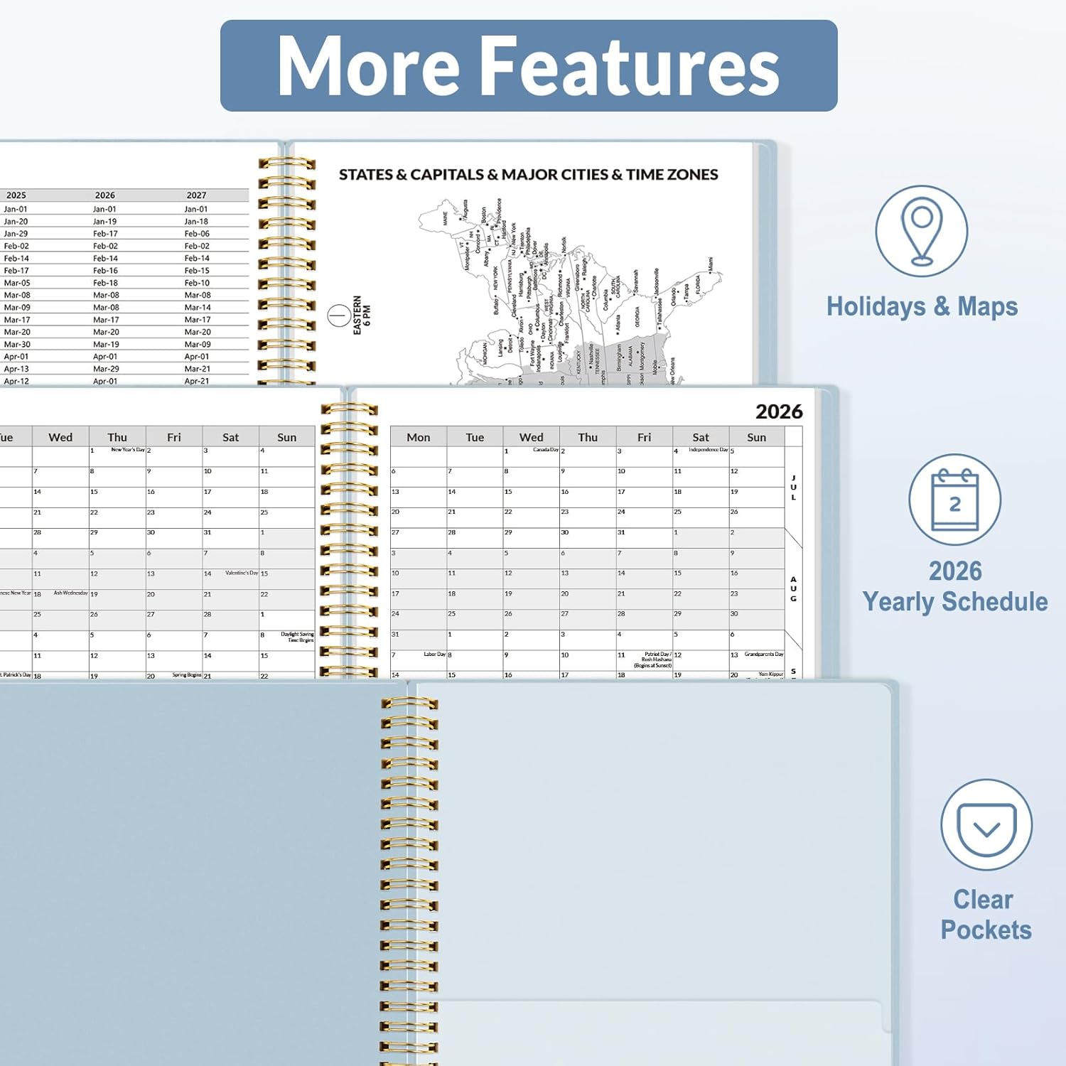 - Additional Features - The weekly planner includes 2026-2028 calendars, year schedule for full year 2026, holiday lists, contact pages, notes pages, important dates, and US time zone map. Rainbow monthly tabs simplify navigation and add a stylish, playful element to the planner's aesthetic.