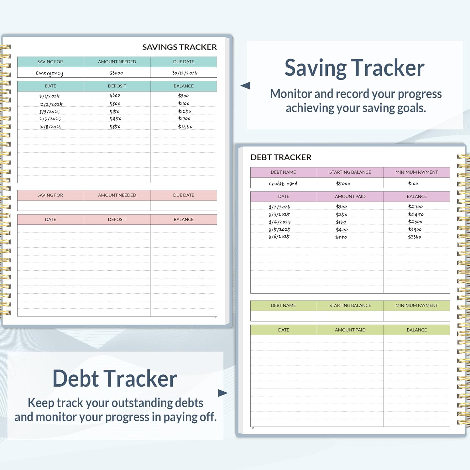 - UNDATED DESIGN & 1 YEAR USE - Undated finance books start with 1 page-financial goals, 1 page-Mind Map, 1 page-Financial Strategy, 1 page-Tactics, 2 pages-Important Dates, 4 pages-Bill Tracker, 4 pages-Saving Tracker, 8 pages-Debt Tracker, followed by 12 Months(10 pages per month, 1 unique color for each month). 2 pages-Christmas Budgeting, 2 pages-Yearly Summary, 2 pages-Check Register and 12 pages-Notes(dotted). It is UNDATED, so you could start at any time, suitable for 1 year use.
