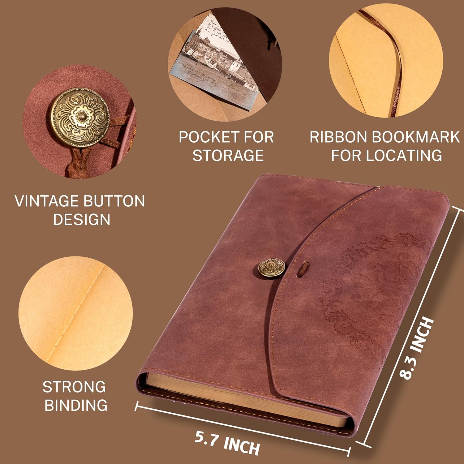 - VINTAGE JOURNAL: The journal cover is made of high quality vegan-friendly leather, which has a soft, suede-like feel, vintage and charming. Exquisite button and string can keep junk journal better closed, stylish embossing add vintage vibe to writing and diary!
