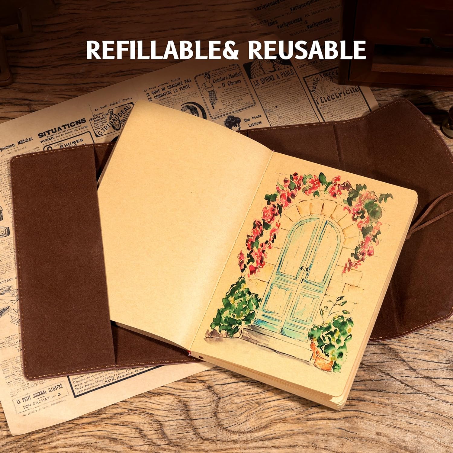 - REFILLABLE& REUSABLE: Unique fillable design, you can fill it with fresh paper to begin a new adventure! Reusable as a travel journal, junk journal, book of shadows, artist's sketchbook, a beautiful drawing/painting journal, writing diary.