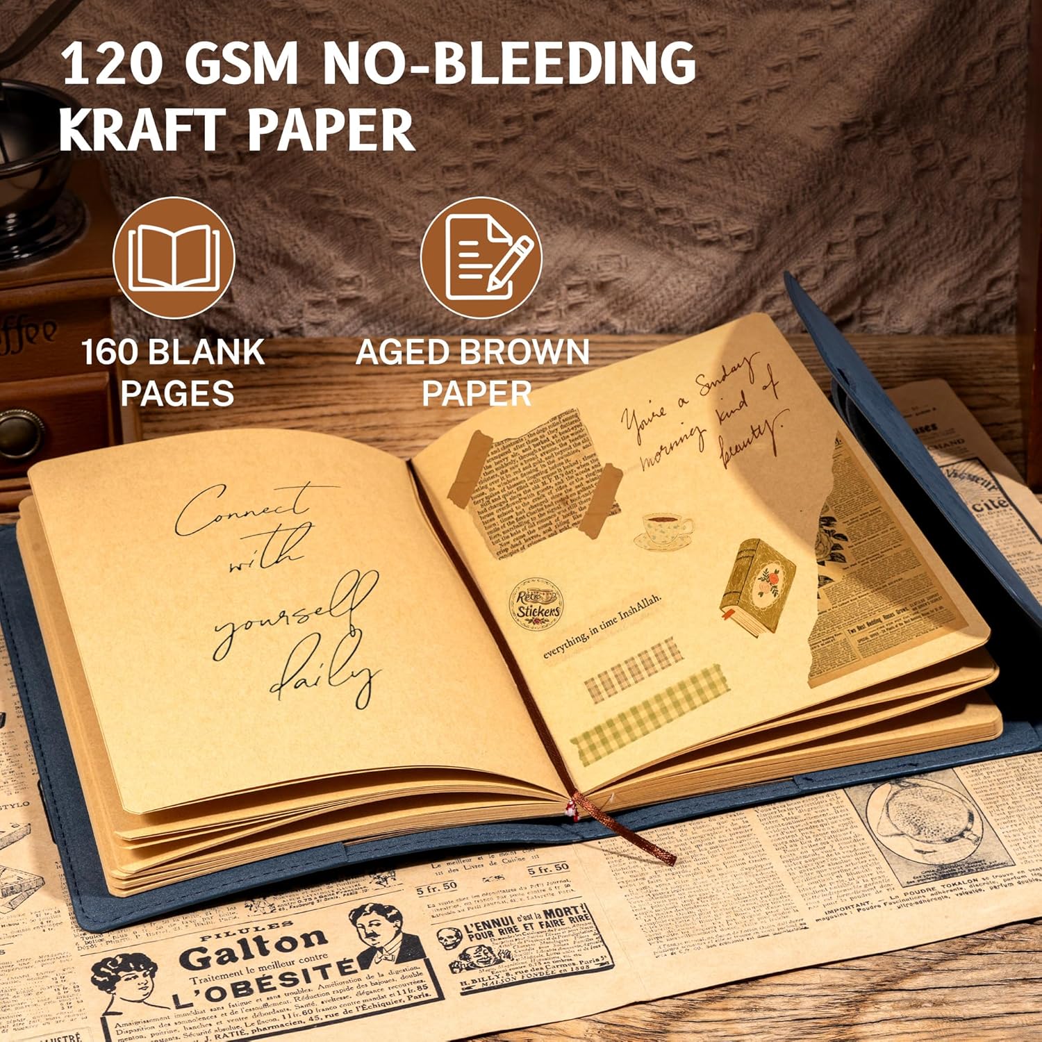 - PREMIUM KRAFT PAPER: The leather journal is made of 120 GSM aged brown colorkraft paper, which complements the cover. 160 pages sturdy blank paper for a smooth creative experience and not easy to bleed and ghost.