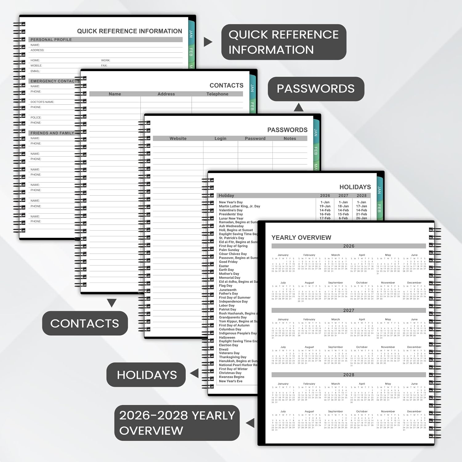 - š Specialties - 8" x 10" Monthly Calendar Planner Pages | 8 Contacts Pages | 4 Password Pages | Notes Section | 2026-2028 Yearly Overview | 2026-2028 Holidays | Notes Pages | Reference Calendars | Monthly Tabs | Double-sided Pockets | Thicker Paper | Flexible Cover.