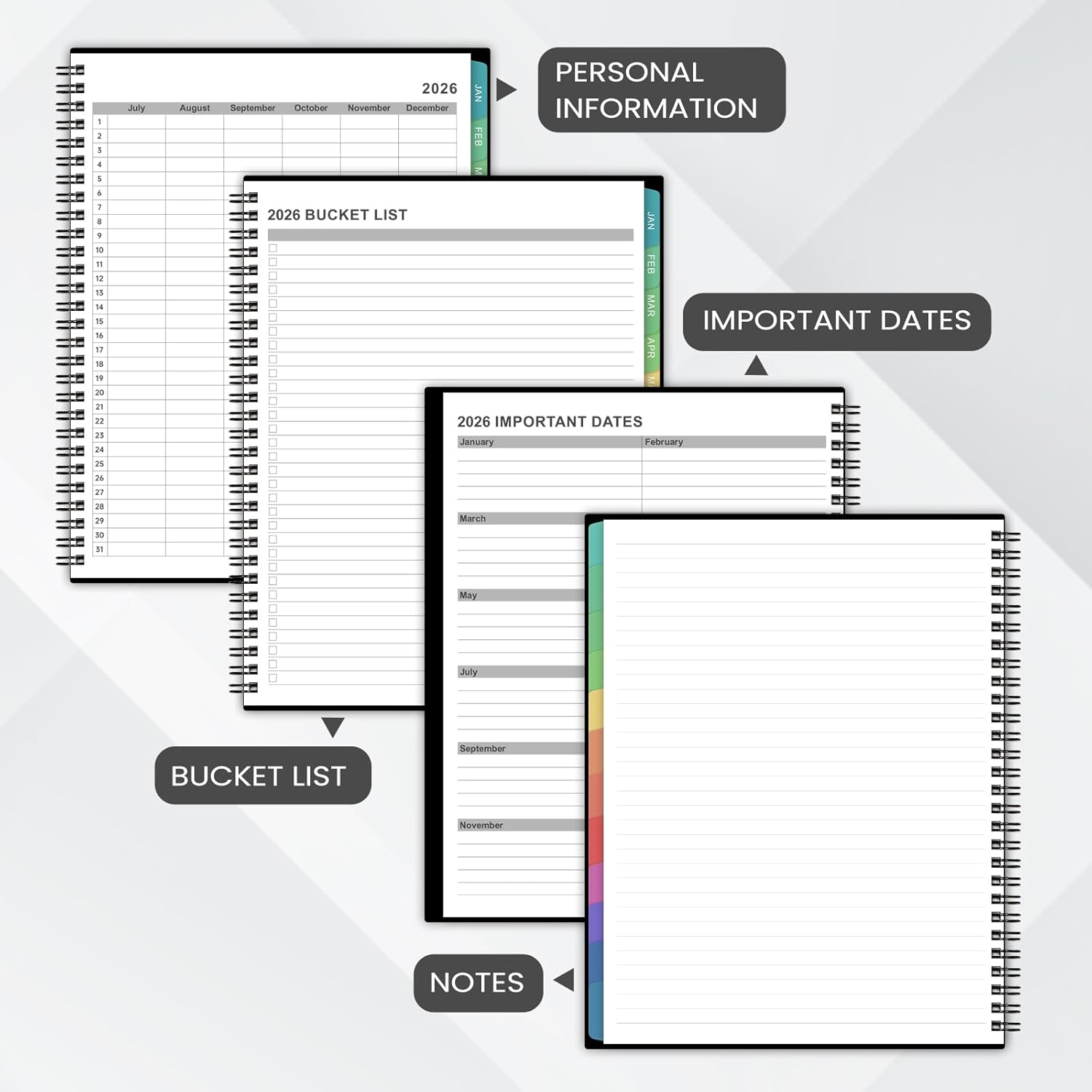- š Functional Design - Highlighted holidays and Julian dates will make efficiency for your life. Durable and strong twin-wire allows the planner to flip 360° and lay flat for efficient writing. Monthly tabs of our planner 2026 helps you track and posit your schedule quickly. The back pocket can store your scattered items, such as cards, letters, documents, etc.