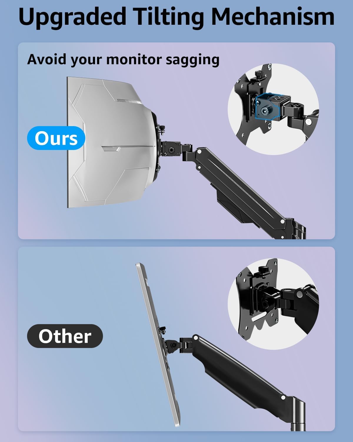 - Avoid Monitor Sagging: The monitor arm features an upgraded tilt structure with dual locking screws that effectively eliminate screen sagging. These precision-engineered limit screws securely maintain your display at the desired vertical position, ensuring long-term stability without gradual drooping. The reinforced joint mechanism provides consistent holding power, even with heavier monitors at maximum extension.