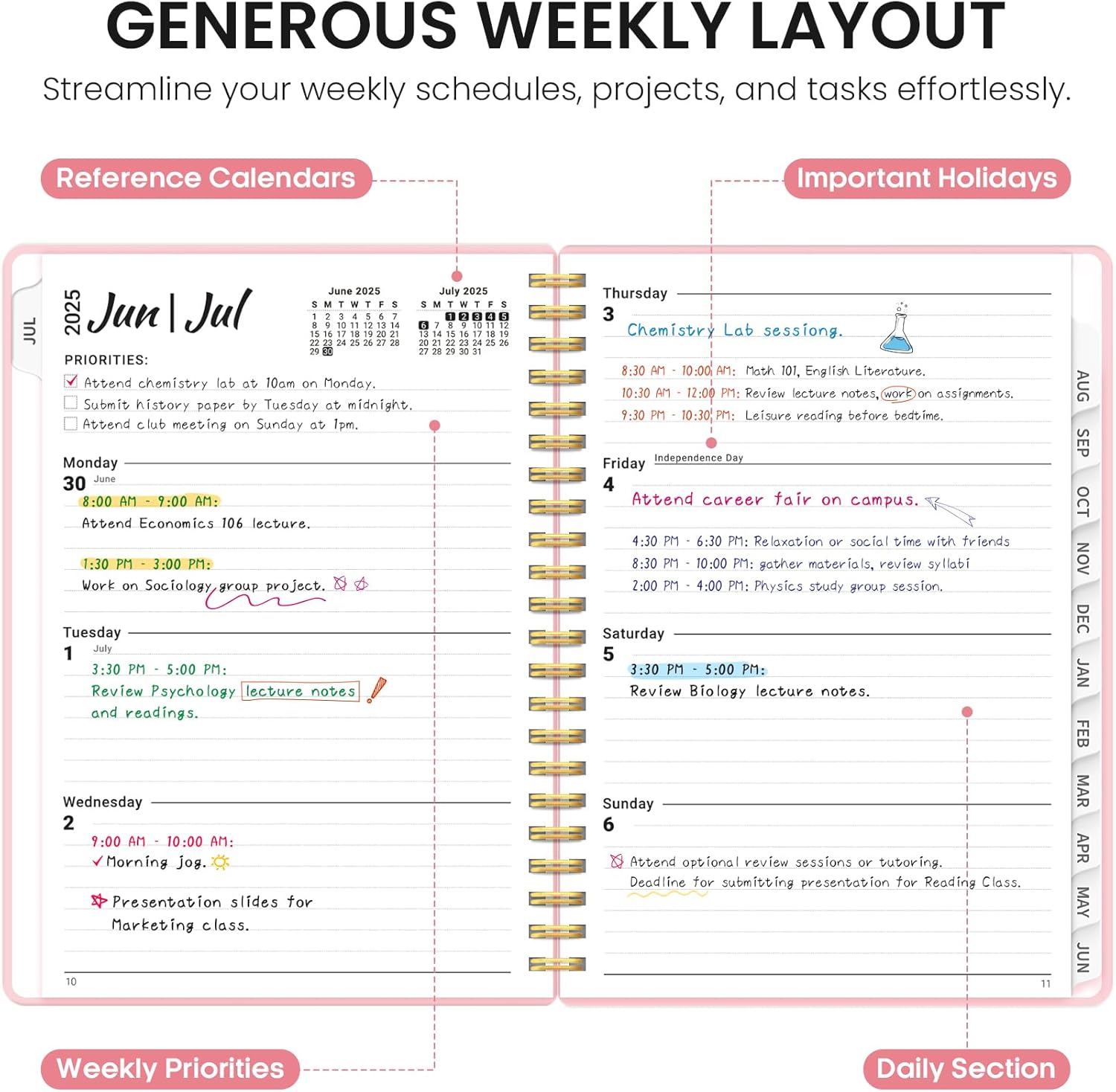 - Comprehensive Planning:The planner covers the school year from July 2025 to June 2026, offering 12 months of planning. Monthly and weekly calendar pages provide ample room to manage your schedule, set goals, and track progress.