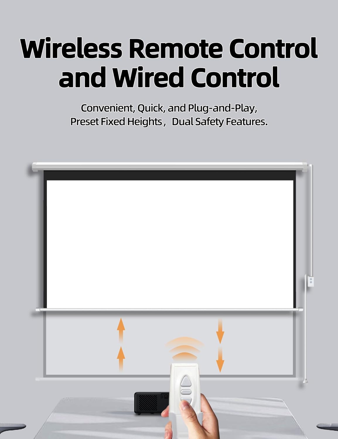 - Motorized Convenience: Effortlessly lower and raise your screen with the included remote control. Enjoy quiet, smooth motorized operation for a seamless home theater or presentation experience.