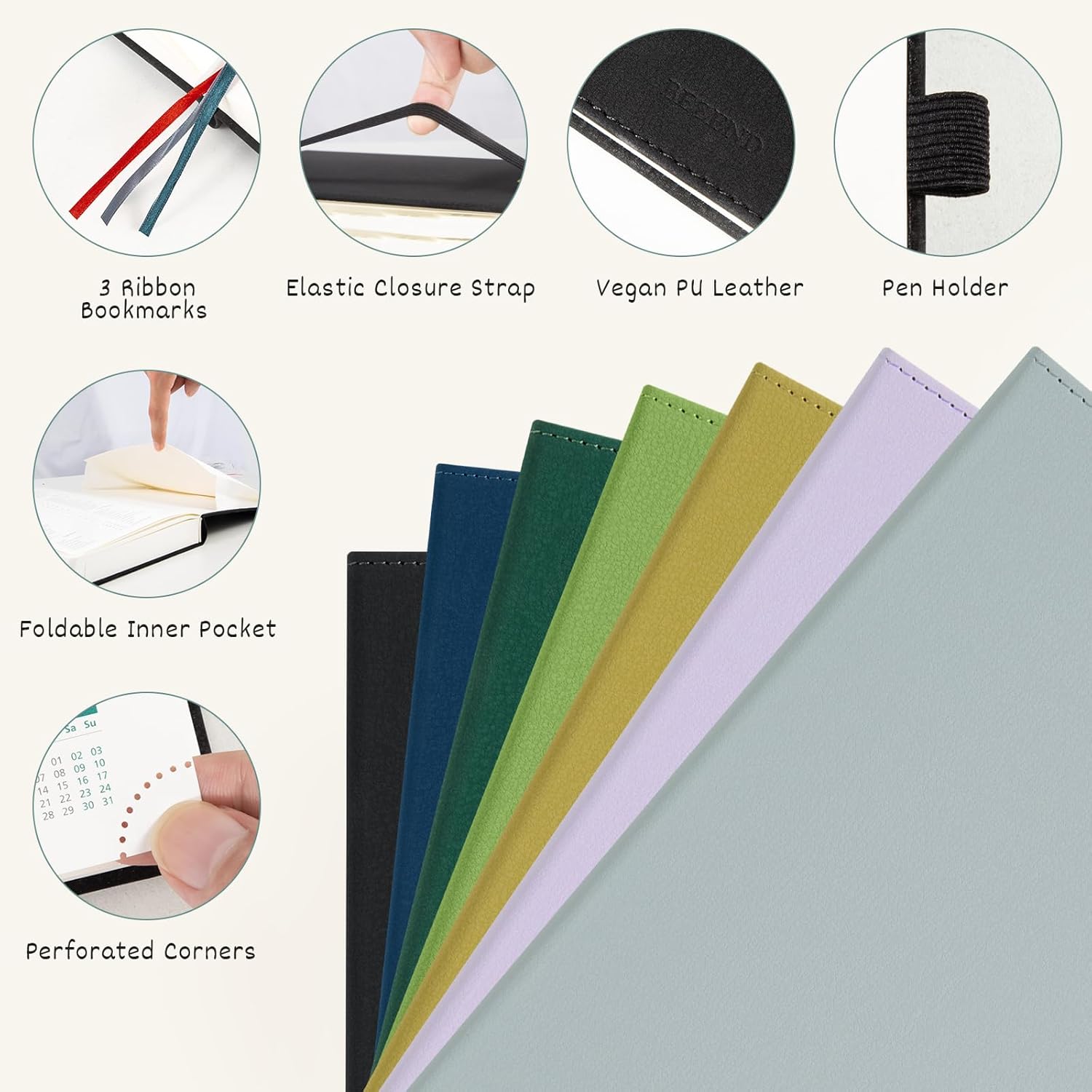 - QUICK SEARCH & DESIGNS: 3 Ribbon Bookmarks + Perforated Tear-off Corners + Monthly Tabs || Elastic Closure Strap + Foldable Inner Pocket + Pen Holder