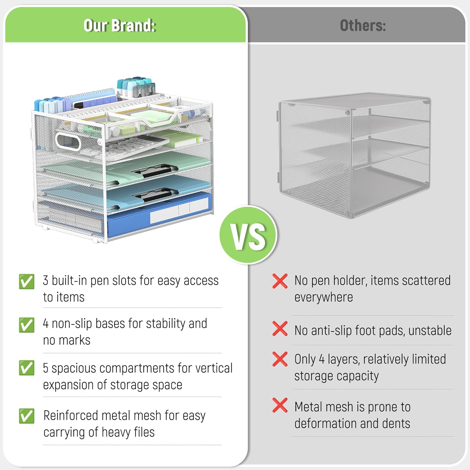 - Ergonomic Design with Non-Slip Pads-Equipped with 4 anti-slip rubber feet to prevent scratches on surfaces and enhance stability in your desk organization system. The open-front design allows quick access to files in this desktop organizer, while the ergonomic handles enable easy portability between workstations