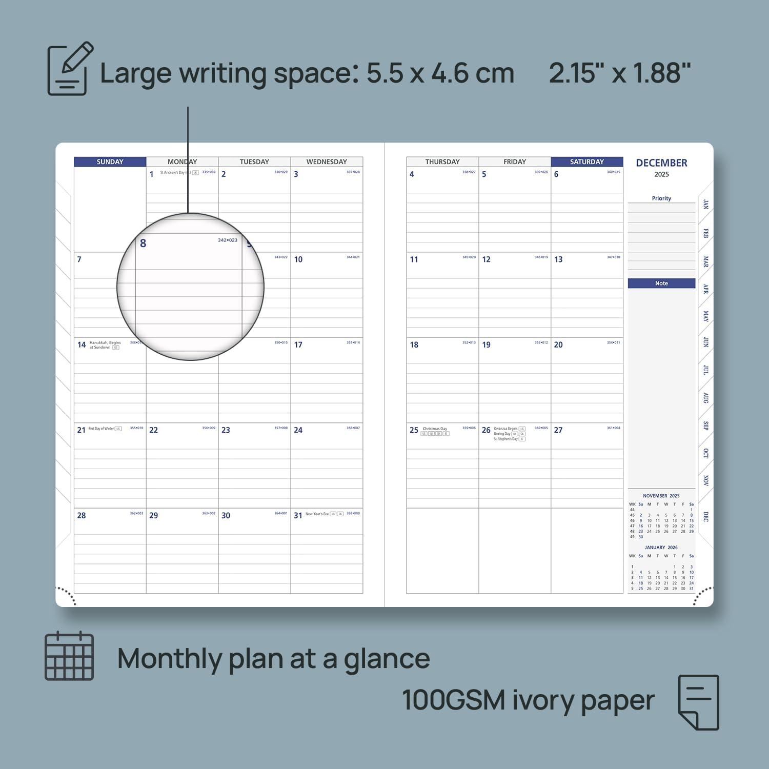 - EXTRA PAGES - This monthly planner 26-27 also contains "2026-2027" Year Planner Pages + Holiday Reference Pages + "2026" Calendar Page + Expenses Pages+ Password Page + Contacts Pages + 6 Dotted Notes Pages + 6 Line Note Pages for jotting down your ideas, thoughts or any other happy things in detail.