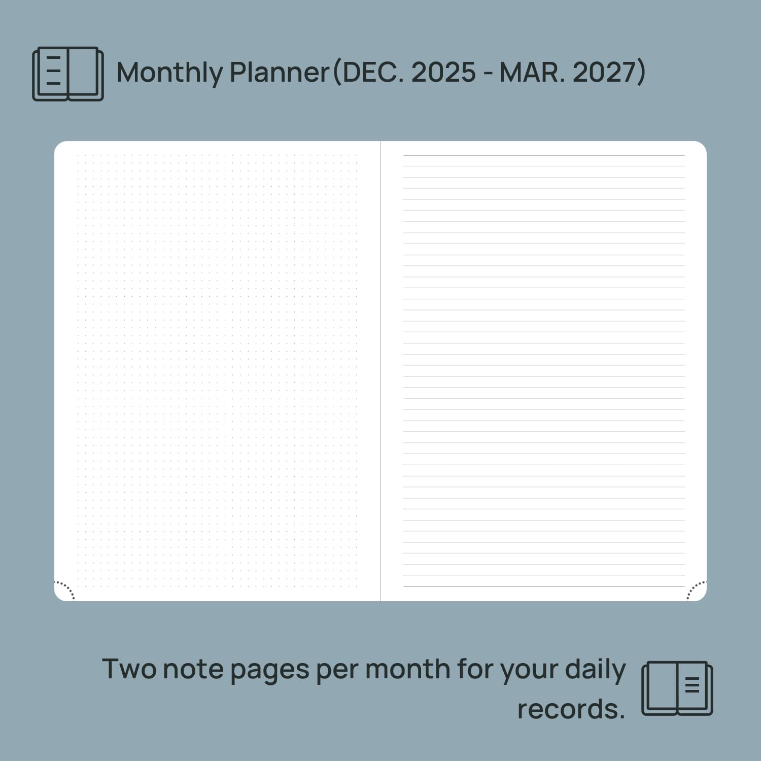 - 2 PAGES PER MONTH: This monthly calendar book presents a spacious and unique calendar-like design, each month has a 2-Page spread with dotted and lined notes to help you manage deadlines and goals effectively.