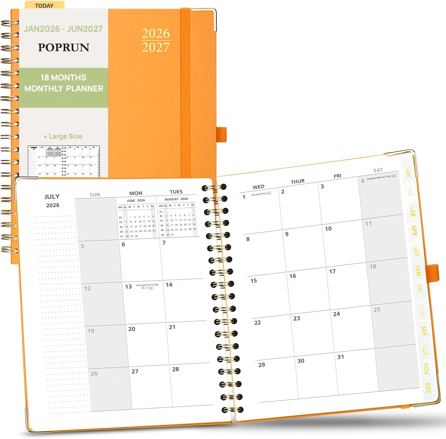 POPRUN Monthly Planner 2026-2027 Spiral Hardcover (8'' x 10''), 18 Months Calendar (Jan.2026-Jun.2027) - 2 Pages per Month with Dotted Note Pages, Sunday Start, Laminated Tab - Orange