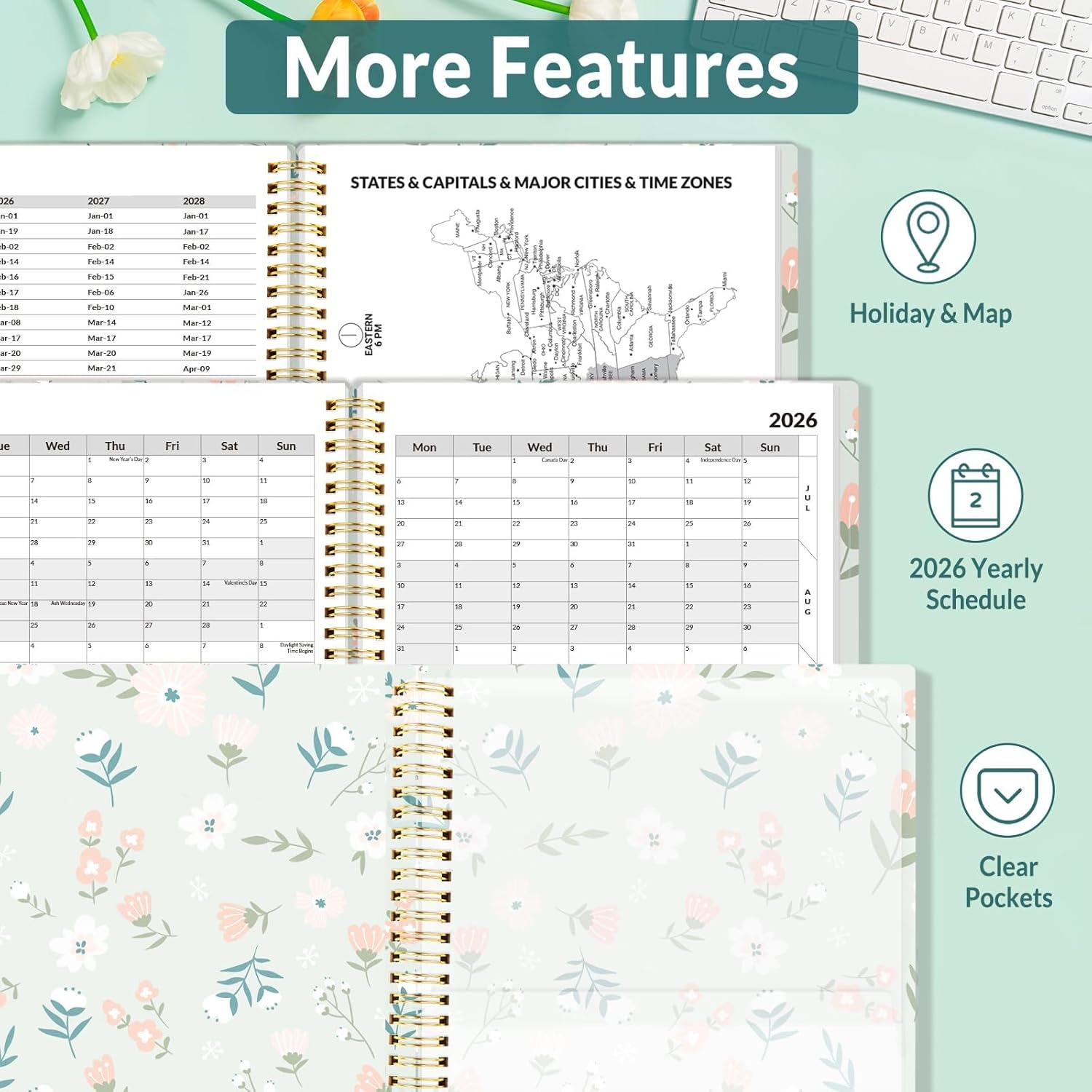 - Additional Features - The weekly planner includes 2026-2028 calendars, year schedule for full year 2026, holiday lists, contact pages, notes pages, important dates, and US time zone map. Rainbow monthly tabs simplify navigation and add a stylish, playful element to the planner's aesthetic.