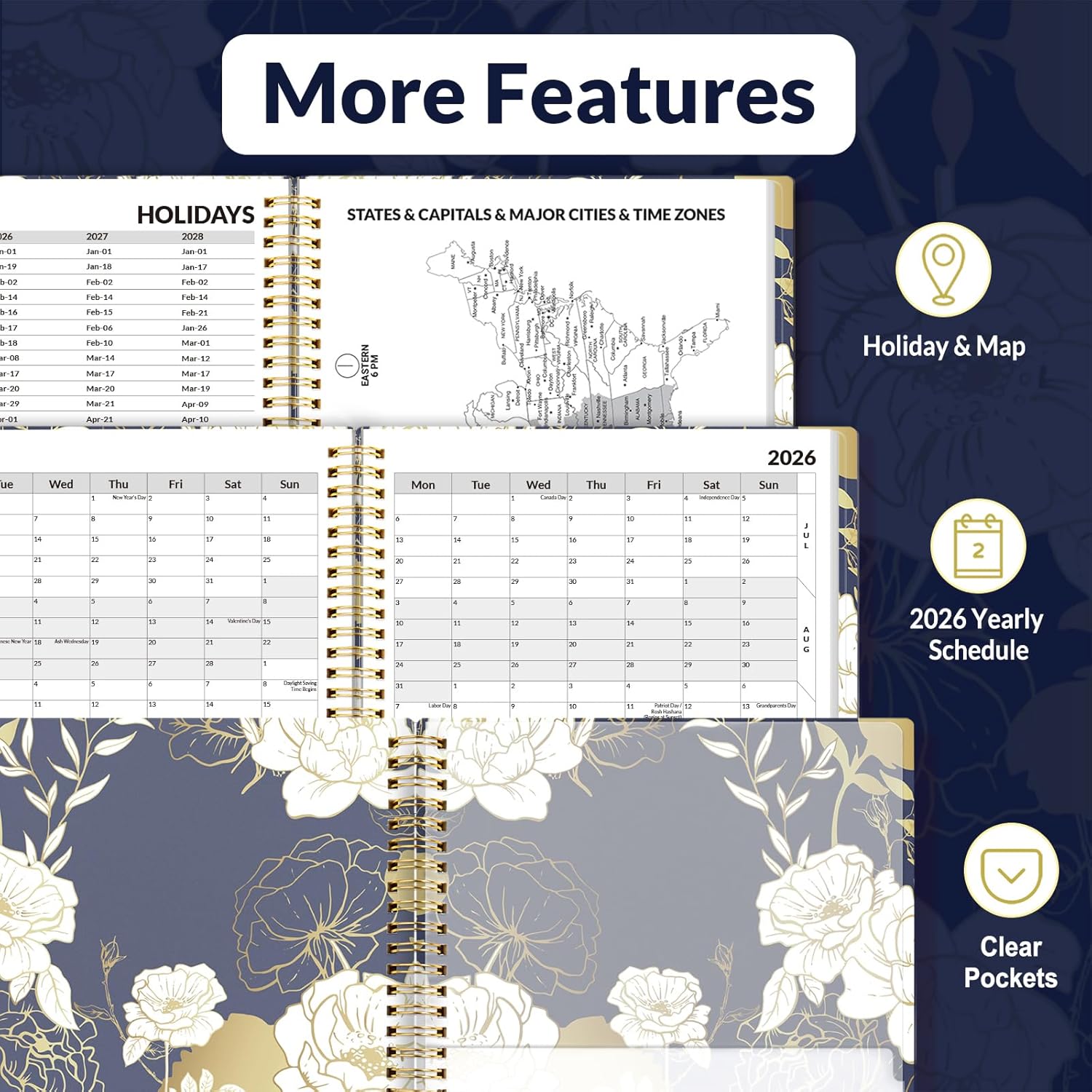 - Additional Features - The weekly planner includes 2026-2028 calendars, year schedule for full year 2026, holiday lists, contact pages, notes pages, important dates, and US time zone map. Rainbow monthly tabs simplify navigation and add a stylish, playful element to the planner's aesthetic.