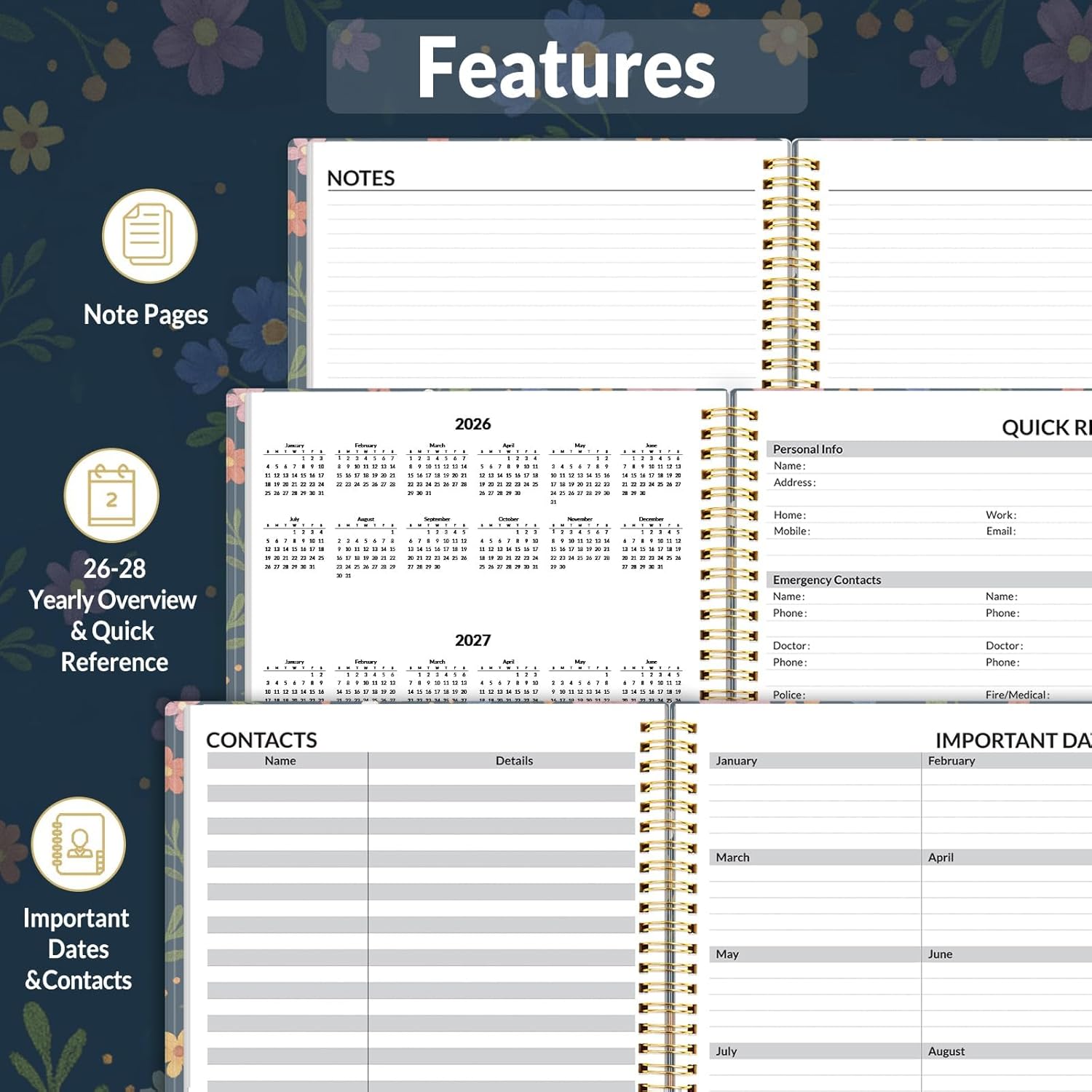 - Additional Features - The weekly planner includes 2026-2028 calendars, year schedule for full year 2026, holiday lists, contact pages, notes pages, important dates, and US time zone map. Rainbow monthly tabs simplify navigation and add a stylish, playful element to the planner's aesthetic.