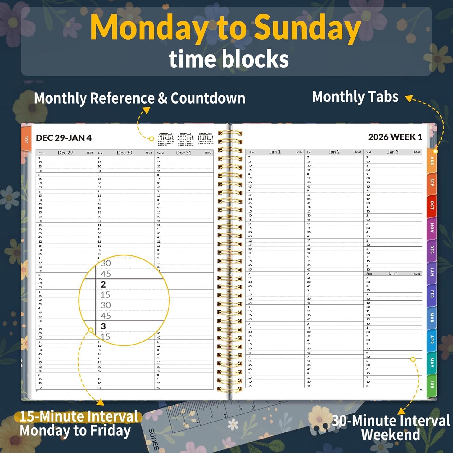 SUNEE 2026 Appointment Book, Quarter-Hourly, Weekly & Monthly - from January 2026 - December 2026, 8.5"x11" Weekly Planner, Flexible Cover, Note Pages, Pockets, Bookmark, Spiral Binding, Navy Flower
