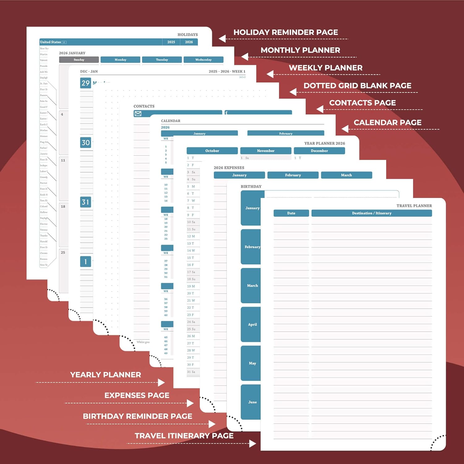 - Universal Design Planner: Suitable for a variety of people and scenarios. Professionals manage project progress, meeting arrangements and goals; student planner 2026 courses, exams and extracurricular activities; home users arrange travel, activitie