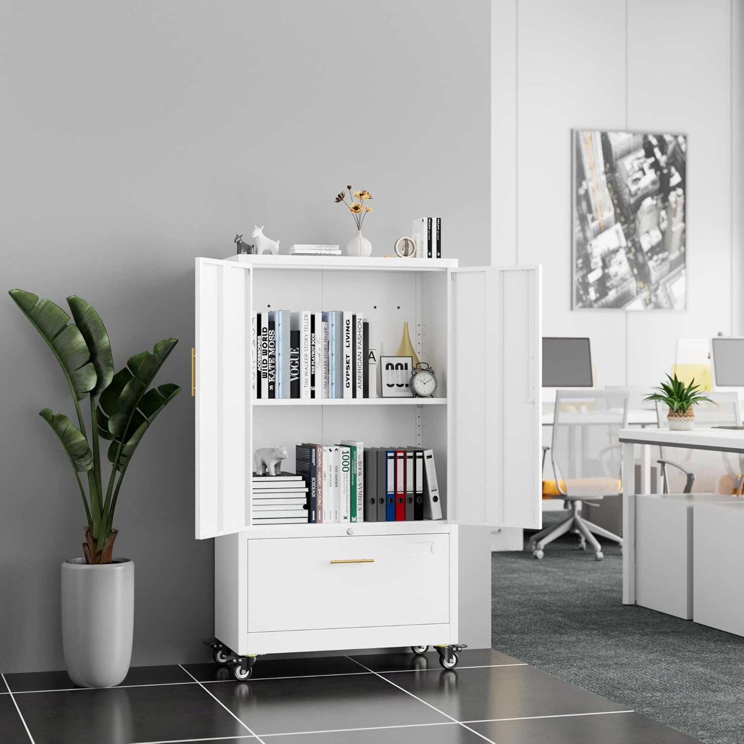 Aobabo Metal 1 Drawer Office File Cabinet with Lock and 2 Doors, Office Steel Files Cabinet with Wheels, Legal/Letter A4 Size, Assembly Required, White