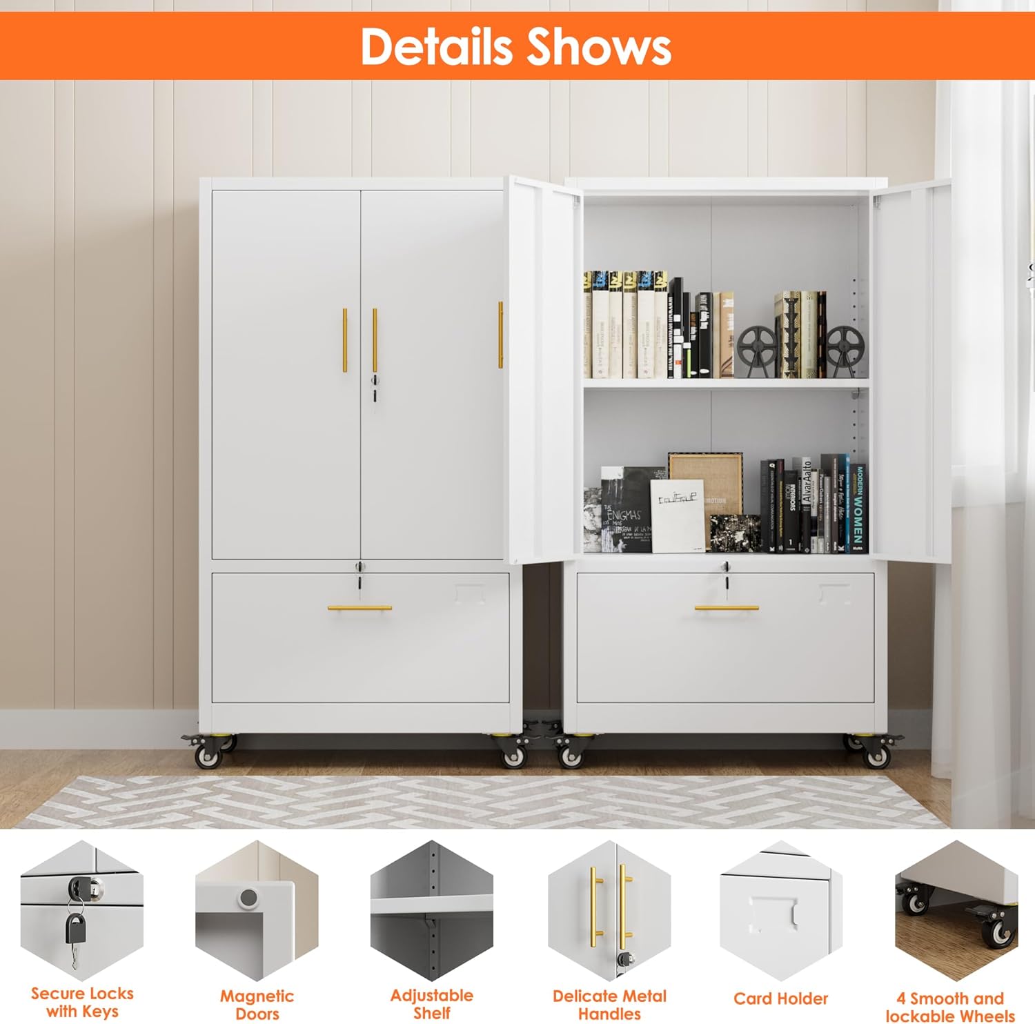 - Lockable Doors & Drawer: Both the upper double doors and lower file drawer feature built-in key locks (or combination locks*) to safeguard personal belongings, office files, or sensitive documents from unauthorized access