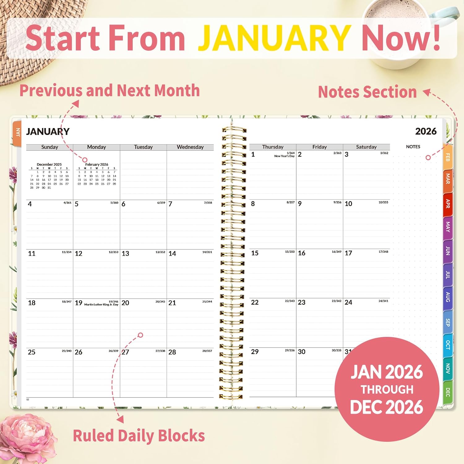 - All-in-One Layout: Combines monthly and weekly dual-page spreads, featuring holiday references, note sections, and extra room for long-term planning – no more flipping back and forth