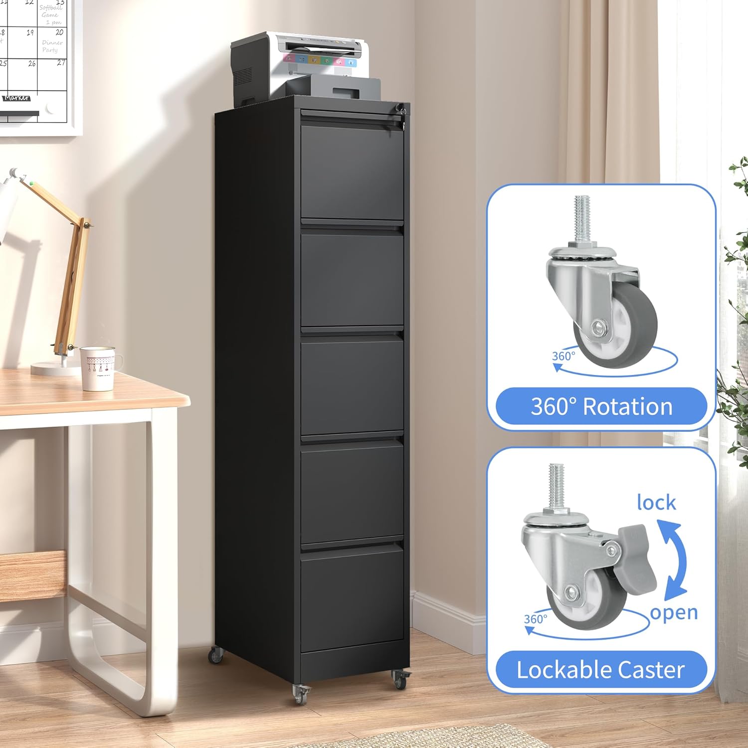 - 【Rolling Fill Cabinet】This 5 drawer under desk file cabinet equipped with 2 lockable casters, 2 x 360° swivel casters and1x anti-tilt wheel. The anti-tilt caster to prevent tipping over. You can easily move the cabinet with wheels, making it easy for you to move to another place.