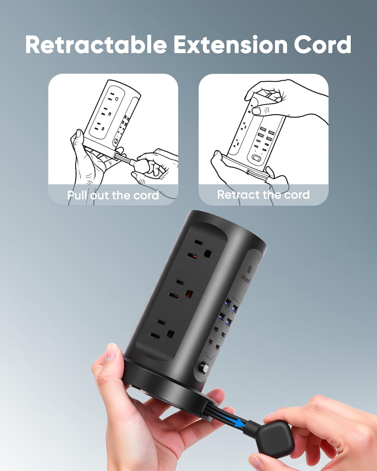 - 6Ft Retractable Extension Cord: The power strip features a 6ft retractable extension cord. Hold the base to pull out the extension cord to get the desired length, and rotate the tower body to retract the extension cord. Say goodbye to tangled wires and keep your workspace clean