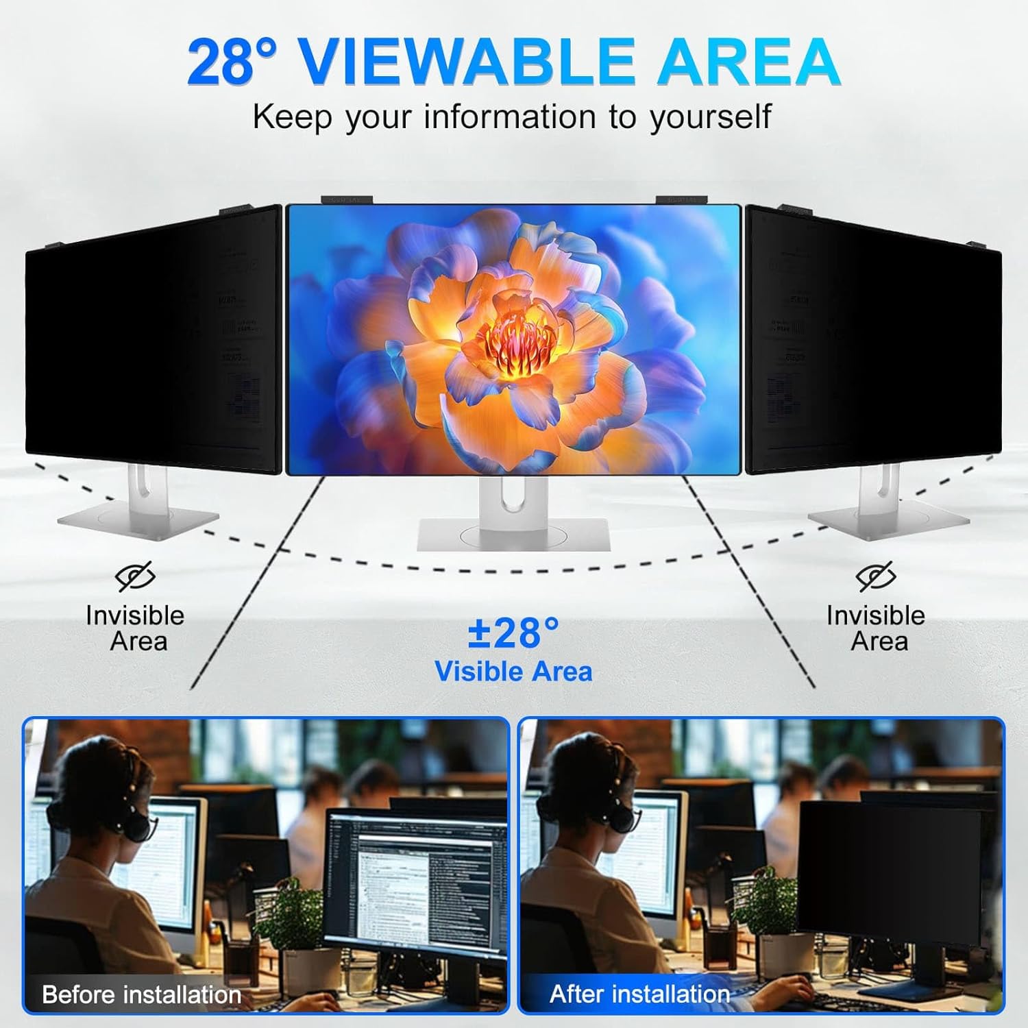 - [install/remove within 1 second - Effortless Magnetic Design]: Zero installation with infinitely reusable magnets! This privacy screen for computer monitor instantly automatic adsorption to your monitor and removes cleanly, no adhesives. Switch between devices or scenarios effortlessly with the hanging magnetic privacy screen for monitors, easily remove it and hang it on the back of your monitor when you don't need it. making it the most convenient computer screen privacy shield