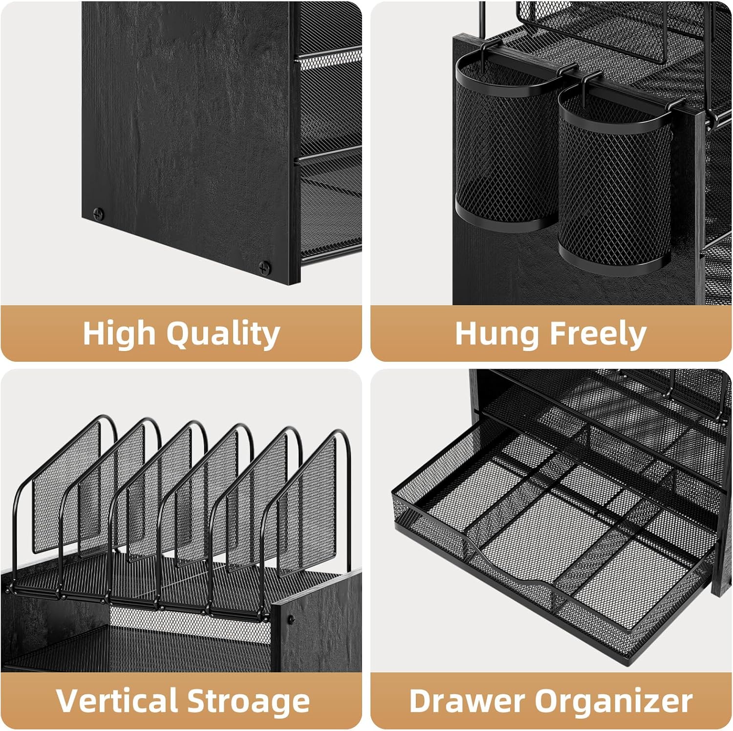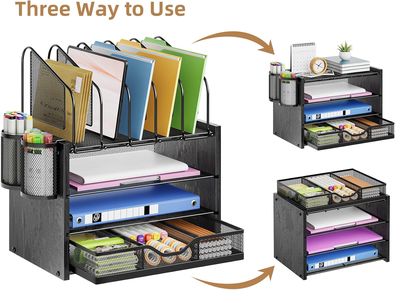 - 【Multifunctional Desk organizer】Our upgrade desktop file organizer has vertical and horizontal storage space – 4 Tiers +5 vertical sorters +3 compartments drawer+ additional 2 pen holders . Upright section has five 2" Compartments for magazines, bill, file, book. Three types of use to meet your various office needs!!