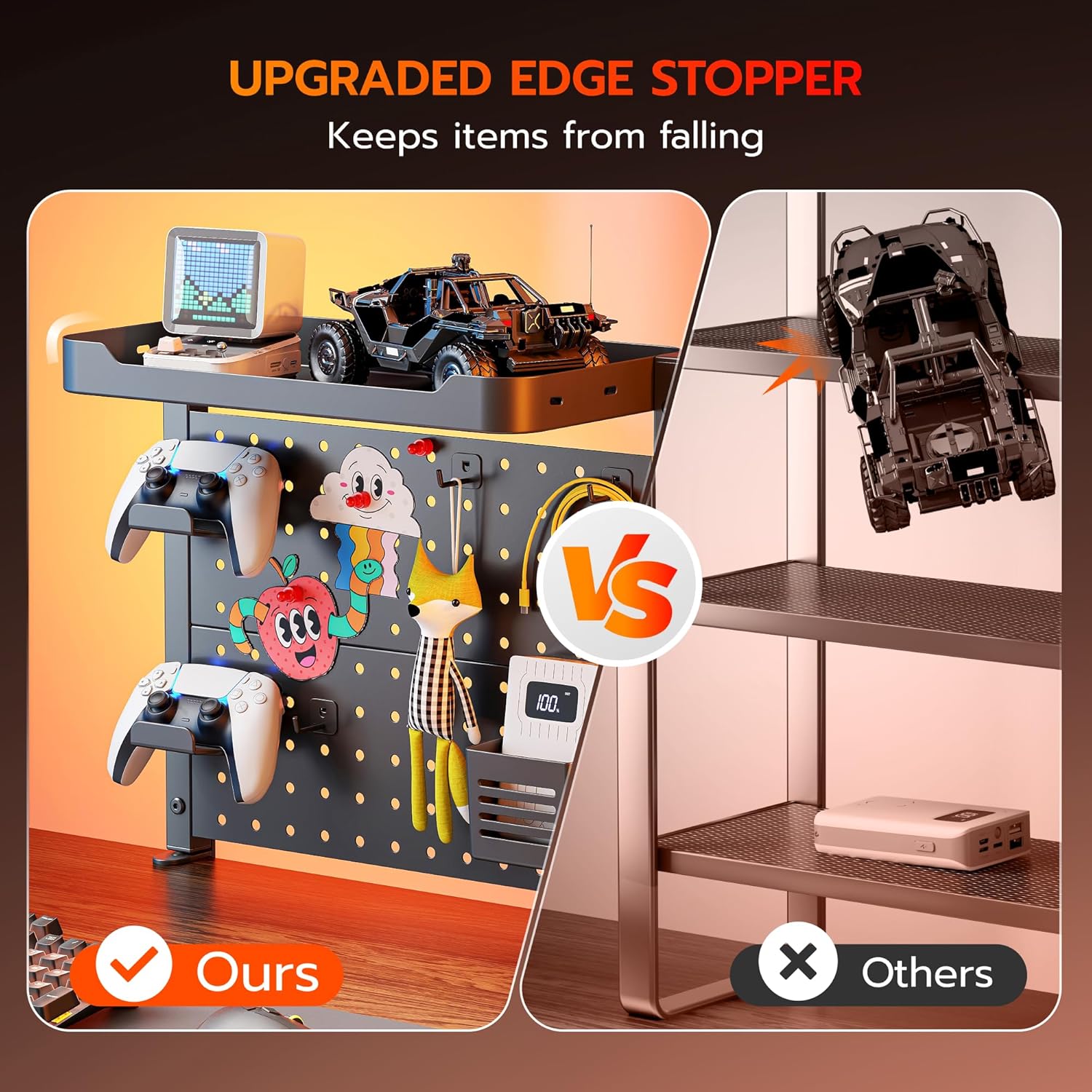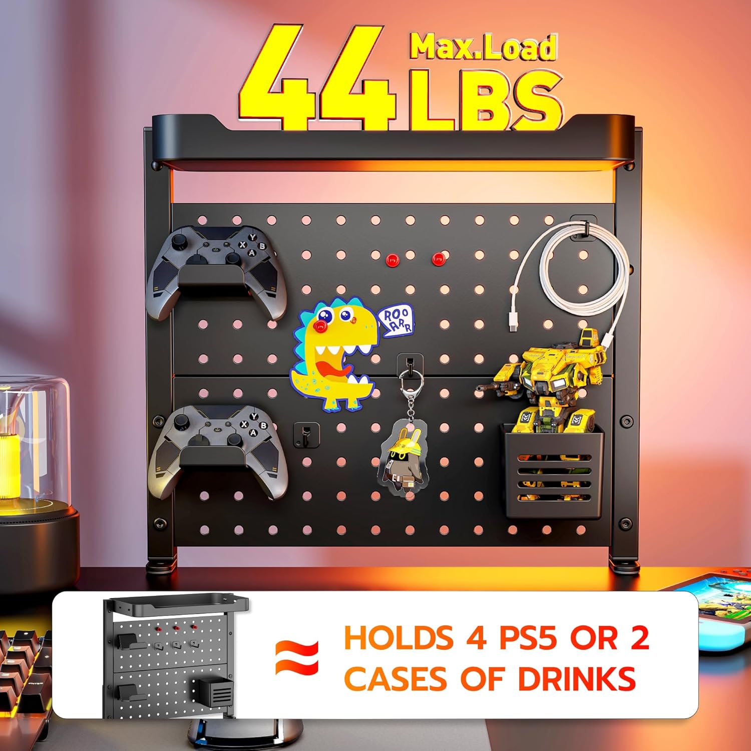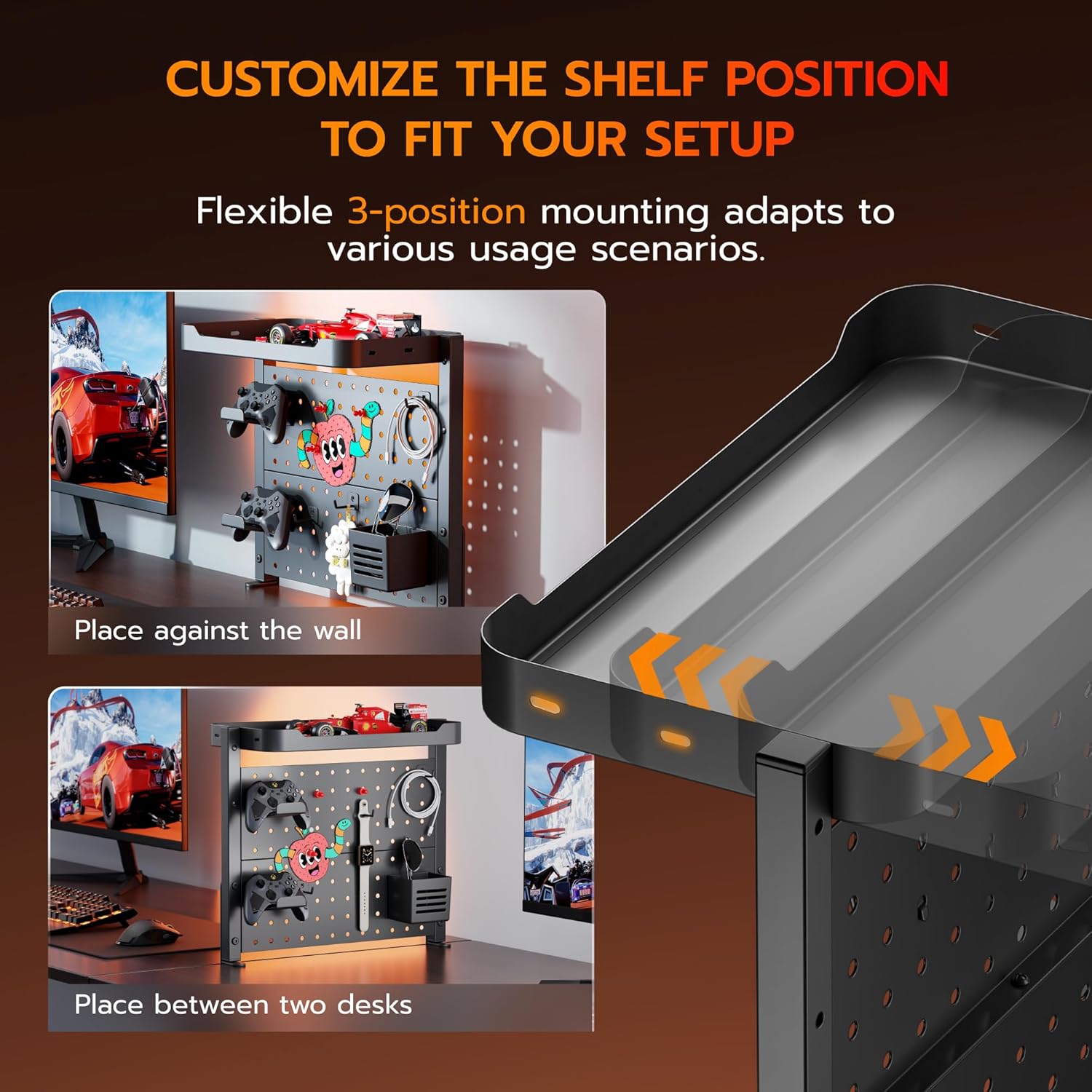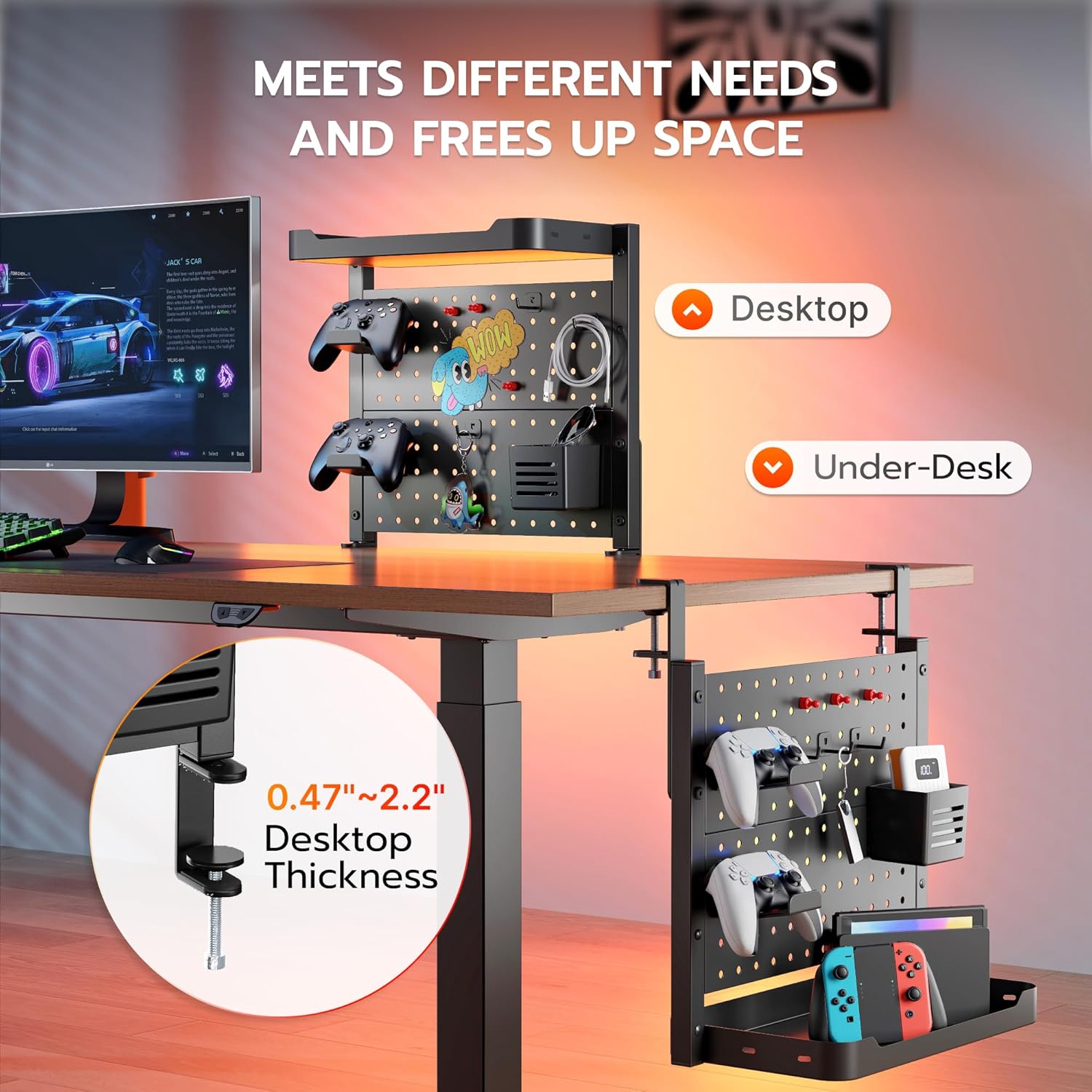 - ăCustomizable with AccessoriesăThis peg board shelf offers unparalleled flexibility with its edge-mounted design, supporting both above and under desk configurations. Use the above-desk setup for easy access to frequently used daily items, or opt for the under-desk installation to store cables, chargers, or hidden peripherals discreetly. It includes 2 controller holders, 1 pen holder, 3 magnets, and 3 hooks, allow you to fully customize the setup to suit your specific needs.